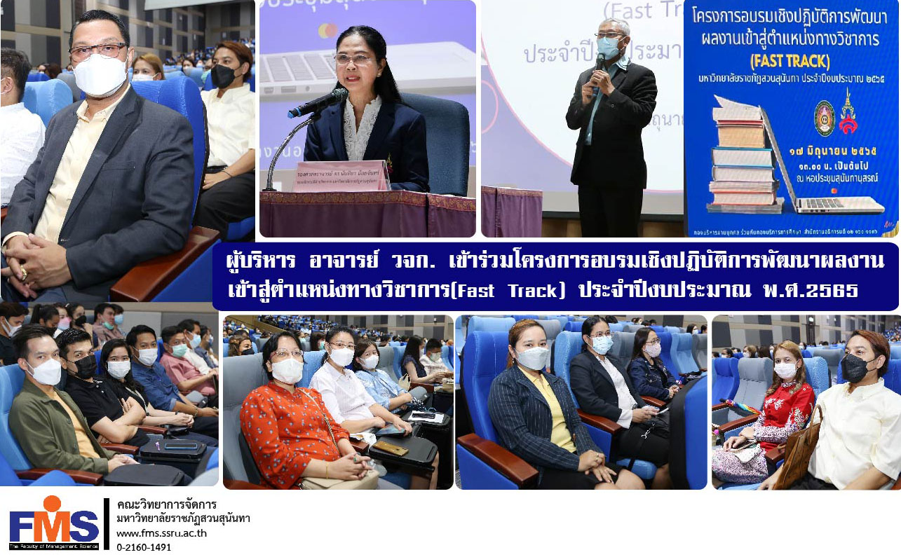 วันที่ 17 มิถุนายน 2565 ผู้ช่วยศาสตราจารย์ ดร.สมศักดิ์ คล้ายสังข์ คณบดีคณะวิทยาการจัดการ พร้อมด้วยรองคณบดี และอาจารย์ประจำคณะ เข้าร่วมโครงการอบรมเชิงปฏิบัติการพัฒนาผลงานเข้าสู่ตำแหน่งทางวิชาการ (Fast Track) มหาวิทยาลัยราชภัฏสวนสุนันทา ประจำปีงบประมาณ พ.ศ.2565 โดยรองศาสตราจารย์ ดร.นันทิยา น้อยจันทร์ รองอธิการบดีฝ่ายวิชาการ เป็นประธานกล่าวเปิดโครงการ ในโอกาสนี้รองศาสตราจารย์ ดร.วิทยา เมฆขำ รองอธิการบดีฝ่ายแผนงานและประกันคุณภาพ ให้เกียรติเป็นวิทยากรบรรยายในหัวข้อ “หลักเกณฑ์การเข้าร่วมโครงการเข้าสู่ตำแหน่งทางวิชาการ (Fast Track)” และได้รับเกียรติจาก ศ.ดร.อลงกต แทนออมทอง บรรยาย “ขั้นตอนการเขียนขอตำแหน่งทางวิชาการ” ณ หอประชุมสุนันทานุสรณ์ และการประชุมรูปแบบออนไลน์ผ่านโปรแกรม Google Meet