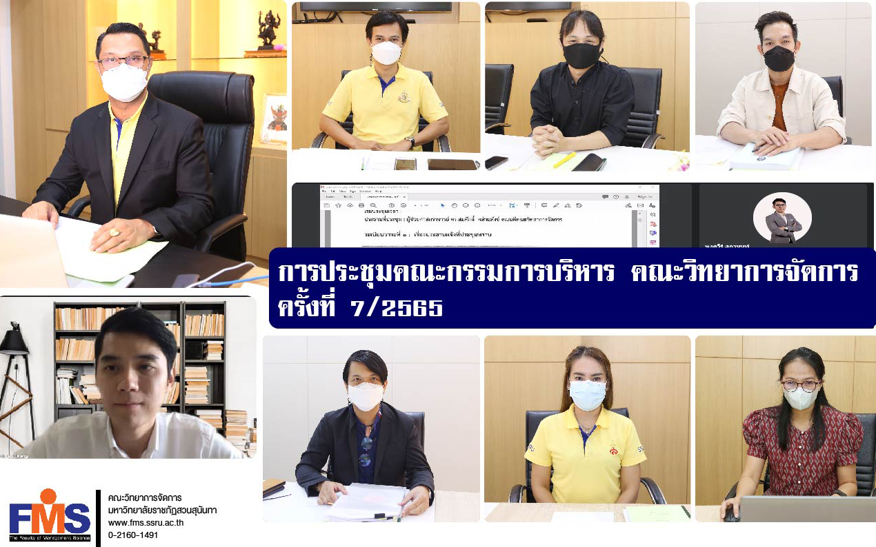 วันที่ 27 กรกฎาคม 2565 เวลา 09.30 น. คณะวิทยาการจัดการ มหาวิทยาลัยราชภัฏสวนสุนันทา จัดประชุมคณะกรรมการบริหารคณะ ครั้งที่ 7 /2565 โดยผู้ช่วยศาสตราจารย์ ดร.สมศักดิ์ คล้ายสังข์ คณบดีคณะวิทยาการจัดการ เป็นประธานการประชุม พร้อมด้วยรองคณบดี หัวหน้าสำนักงานคณบดี และหัวหน้าฝ่ายบริหารงานทั่วไป เข้าร่วมประชุม ณ ห้องประชุมรวมใจการจัดการ คณะวิทยาการจัดการ และการประชุมผ่านระบบออนไลน์ Google Meet