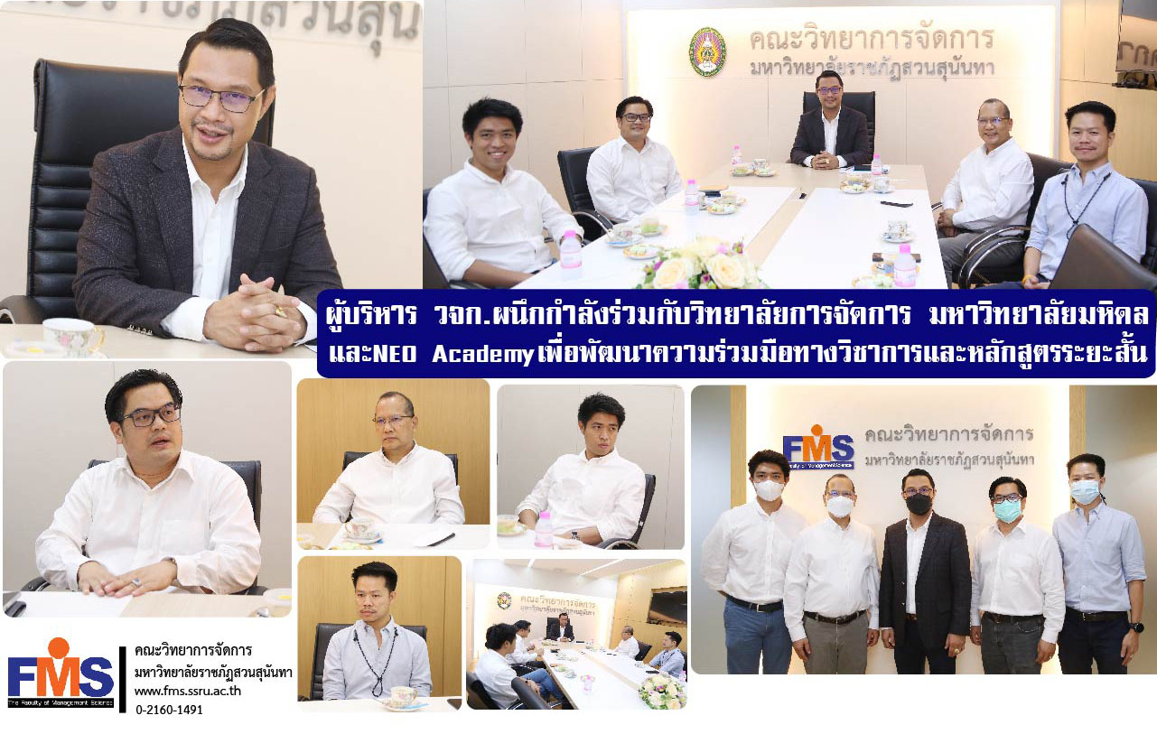 วันที่ 8 สิงหาคม 2565 เวลา 14.00 น. ณ ห้องประชุมรวมใจการจัดการ 1 คณะวิทยาการจัดการ ผู้ช่วยศาสตราจารย์ ดร.สมศักดิ์ คล้ายสังข์ คณบดีคณะวิทยาการจัดการ เป็นประธานการประชุมหารือความร่วมมือทางวิชาการและหลักสูตรระยะสั้น ร่วมกับวิทยาลัยการจัดการ มหาวิทยาลัยมหิดล และ NEO Academy ซึ่งเป็นผู้นำด้าน Digital Content Online Course ด้านบริหารจัดการ ซึ่งได้รับเกียรติจากผู้ช่วยศาสตราจารย์ ดร.ธนพล วีราสา ประธานหลักสูตรไทยและผู้อำนวยการโครงการ NEO Academy ดร.กฤษกร สุขเวชชวรกิจ ประธานหลักสูตรการจัดการธุรกิจสุขภาพและหัวหน้าหน่วยการตลาดและสื่อสารองค์กร ดร.ตรียุทธ พรหมศิริ ประธานสาขาผู้ประกอบการและนวัตกรรม และนายกฤชนันท์ กำปั่นทอง ผู้แทนจากบริษัท NEO Academy วิทยาลัยการจัดการ มหาวิทยาลัยมหิดล ร่วมประชุมหารือในครั้งนี้ เพื่อเป็นการยกระดับและขับเคลื่อนภาคีเครือข่ายการจัดการศึกษา ทางวิชาการและวิชาชีพ ในการพัฒนาคุณภาพการเรียนการสอนของคณะวิทยาการจัดการต่อไป
