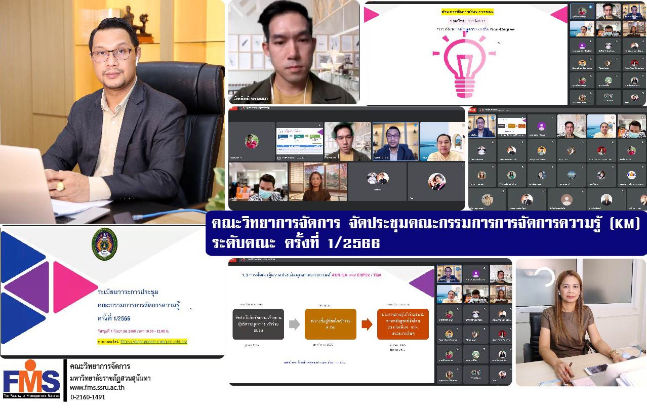 วันที่ 7 กันยายน 2565 ฝ่ายแผนงานและประกันคุณภาพ คณะวิทยาการจัดการ จัดประชุมคณะกรรมการการจัดการความรู้ (KM) ระดับคณะ ประจำปีงบประมาณ พ.ศ. 2566 ครั้งที่ 1/2566 โดยผู้ช่วยศาสตราจารย์ ดร.สมศักดิ์ คล้ายสังข์ คณบดีคณะวิทยาการจัดการ เป็นประธานการประชุม พร้อมด้วยอาจารย์ ดร.อิทธิภูมิ พรหมมา รองคณบดีฝ่ายแผนงานและประกันคุณภาพ ร่วมประชุมเพื่อกำหนดแนวทางในการดำเนินงานและชี้แจงการจัดทำแผนการจัดการความรู้ (KM) องค์ความรู้ที่จำเป็นในการแลกเปลี่ยนเรียนรู้ เพื่อพิจารณาใช้เป็นข้อมูลในการดำเนินงานจัดการความรู้มีความต่อเนื่องและต่อยอดองค์ความรู้ในการดำเนินการจัดการความรู้ (KM) ประจำปีงบประมาณ พ.ศ. 2566 ต่อไป มีหัวหล้ากลุ่มสาขาวิชาบริหารธุรกิจ หัวหน้าสาขาวิชา หัวหน้าแขนงวิชา และบุคลากรหัวหน้าฝ่าย เข้าร่วมประชุมในรูปแบบออนไลน์ผ่านระบบ Google Meet