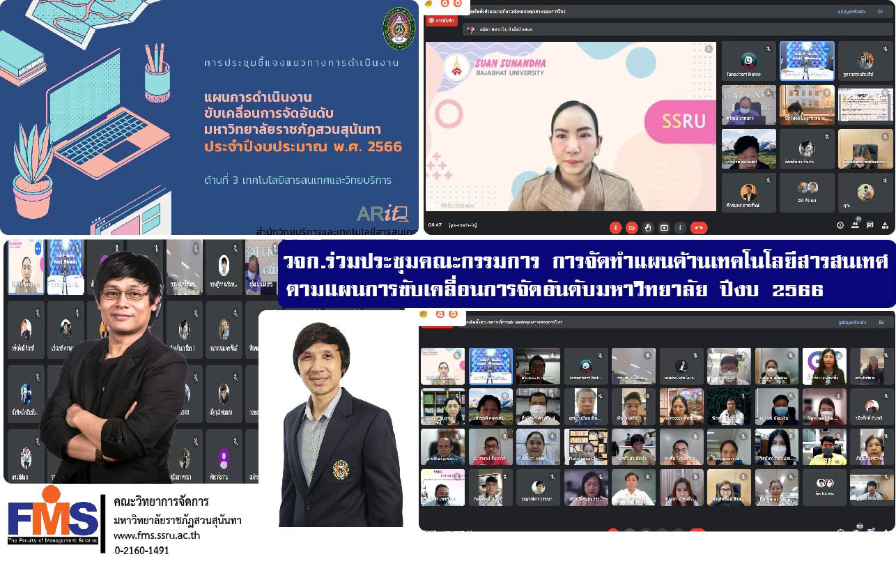 วันที่ 6 ตุลาคม 2565 อาจารย์ ดร.กฤษณะ เชื้อชัยนาท รองคณบดีฝ่ายวิชาการ พร้อมด้วยนายกฤษณ์ปกรณ์ บุญมา นักวิชาการคอมพิวเตอร์ คณะวิทยาการจัดการ เข้าร่วมประชุมคณะกรรมการ การจัดทำแผนด้านเทคโนโลยีสารสนเทศ ตามแผนการขับเคลื่อนการจัดอันดับมหาวิทยาลัย ประจำปีงบประมาณ พ.ศ. 2566 โดยมีผู้ช่วยศาสตราจารย์ ดร.ศิริลักษณ์ เกตุฉาย ผู้อำนวยการสำนักวิทยบริการและเทคโนโลยีสารสนเทศ เป็นประธานการประชุม มีบุคลากรของแต่ละหน่วยงานเข้าร่วมประชุม ในรูปแบบการประชุมออนไลน์ด้วยโปรแกรม Google meet