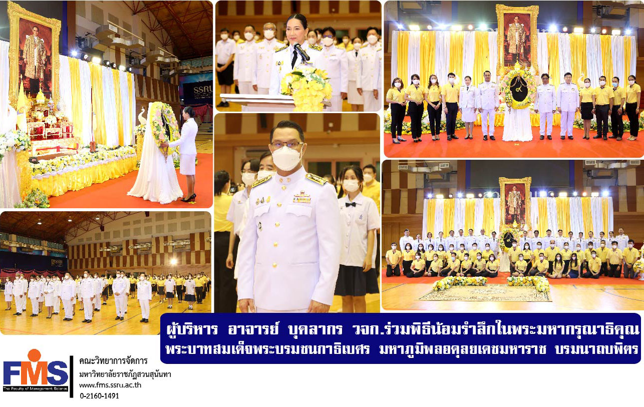 วันที่ 12 ตุลาคม 2565 เวลา 08.30 น. ผู้ช่วยศาสตราจารย์ ดร.สมศักดิ์ คล้ายสังข์ คณบดีคณะวิทยาการจัดการ พร้อมด้วยรองคณบดี อาจารย์และบุคลากรสายสนับสนุนวิชาการประจำคณะ เข้าร่วมพิธีน้อมรำลึกในพระมหากรุณาธิคุณของพระบาทสมเด็จพระบรมชนกาธิเบศร มหาภูมิพลอดุลยเดชมหาราช บรมนาถบพิตร เนื่องในวันคล้ายวันสวรรคต โดยรองศาสตราจารย์ ดร. ชุติกาญจน์ ศรีวิบูลย์ อธิการบดีมหาวิทยาลัยราชภัฏสวนสุนันทา เป็นประธานในพิธีวางพวงมาลา กล่าวน้อมรำลึกในพระมหากรุณาธิคุณฯ มีคณะผู้บริหาร คณาจารย์ บุคลากร นักเรียน และนักศึกษา เข้าร่วมพิธี ณ อาคารศูนย์สุขภาพและกีฬา ชั้น 4 มหาวิทยาลัยราชภัฏสวนสุนันทา