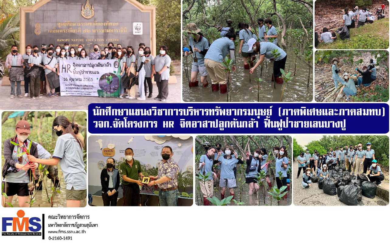 เมื่อวันที่ 16 ตุลาคม 2565 ที่ผ่านมา อาจารย์เปรมใจ เอื้อจิตร์ หัวแขนงวิชาการบริหารทรัพยากรมนุษย์ และอาจารย์อรรณพ ปานพวง อาจารย์ประจำแขนงวิชาการบริหารทรัพยากรมนุษย์ นำทีมนักศึกษาแขนงวิชาการบริหารทรัพยากรมนุษย์ (ภาคพิเศษและภาคสมทบ) คณะวิทยาการจัดการ มหาวิทยาลัยราชภัฏสวนสุนันทา จัดโครงการ “HR จิตอาสาปลูกต้นกล้า ฟื้นฟูป่าชายเลนบางปู” ณ ศูนย์ศึกษาธรรมชาติกองทัพบก (บางปู) เฉลิมพระเกียรติ 72 พรรษา มหาราชินี ตำบลบางปูใหม่ อำเภอเมืองสมุทรปราการ จังหวัดสมุทรปราการ โดยมีวัตถุประสงค์เพื่อปลูกจิตสำนึกในการสร้างความรับผิดชอบต่อสังคมและการฟื้นฟูธรรมชาติป่าชายเลน กิจกรรมประกอบด้วย การเก็บขยะ การปลูกต้นโกงกาง รวมถึงการได้เรียนรู้ด้านธรรมชาติและสิ่งแวดล้อมจากศูนย์การศึกษาธรรมชาติกองทัพบก (บางปู) ซึ่งได้รับเกียรติจากจ่าสิบเอกหัสชัย ไกรยะวุธ (จ่ามด) เป็นวิทยากรให้ความรู้ในครั้งนี้ เพื่อให้ผู้เข้าร่วมโครงการรู้จักการแบ่งปัน การเสียสละ การเป็นผู้ให้มากกว่าผู้รับและตระหนักถึงความสำคัญของการสร้างจิตสำนึกในการบำเพ็ญตนให้เป็นประโยชน์ต่อส่วนรวม