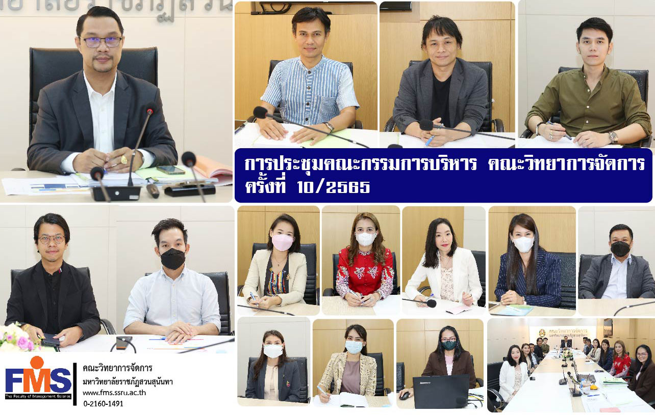 วันที่ 21 ตุลาคม 2565 คณะวิทยาการจัดการ มหาวิทยาลัยราชภัฏสวนสุนันทา จัดประชุมคณะกรรมการบริหารคณะ ครั้งที่ 10 /2565 โดยผู้ช่วยศาสตราจารย์ ดร.สมศักดิ์ คล้ายสังข์ คณบดีคณะวิทยาการจัดการ เป็นประธานการประชุม พร้อมด้วยรองคณบดี หัวหน้าสำนักงานคณบดี และหัวหน้าฝ่ายบริหารงานทั่วไป เข้าร่วมประชุม และพร้อมกันนี้ผู้บริหารและหัวหน้าแขนงวิชาได้ร่วมให้การต้อนรับบุคลากรสายวิชาการใหม่สังกัดคณะวิทยาการจัดการ จำนาน 3 ท่าน ได้แก่ ผู้ช่วยศาสตราจารย์ ดร.ณัฐชาฎ์ ผาสุข อาจารย์ประจำแขนงวิชาการเงินการธนาคาร อาจารย์ ดร.ขนิษฐา เศษคึมบง อจารย์ประจำแขนงวิชาการตลาด และอาจารย์ ดร.วันปิติ แฝงฤทธิ์ อาจารย์ประจำแขนงวิชาธุรกิจระหว่างประเทศ ณ ห้องประชุมรวมใจการจัดการ คณะวิทยาการจัดการ และการประชุมในรูปแบบออนไลน์ด้วยโปรแกรม Google Meet