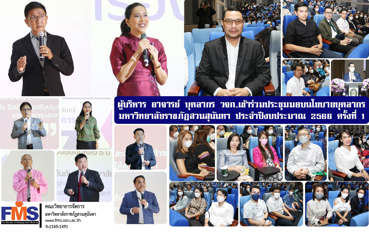 วันที่ 11 พฤศจิกายน 2566 มหาวิทยาลัยราชภัฏสวนสุนันทา จัดประชุมมอบนโยบายบุคลากรมหาวิทยาลัยราชภัฏสวนสุนันทา ประจำปีงบประมาณ 2566 ครั้งที่ 1 ในการนี้ผู้ช่วยศาสตราจารย์ ดร.สมศักดิ์ คล้ายสังข์ คณบดีคณะวิทยาการจัดการ พร้อมด้วยรองคณบดี อาจารย์ หัวหน้าสำนักงานคณบดี และบุคลากรสายสนับสนุนวิชาการ เข้าร่วมประชุมรับฟังนโยบาย โดยมีรองศาสตราจารย์ ดร. ชุติกาญจน์ ศรีวิบูลย์ อธิการบดีมหาวิทยาลัยราชภัฏสวนสุนันทา เป็นประธานกล่าวเปิดพร้อมบรรยายพิเศษ หัวข้อ "มอบนโยบายและแนวทางการขับเคลื่อนมหาวิทยาลัย และได้รับเกียรติจาก รองศาสตราจารย์ ดร.ดร.ฤๅเดช เกิดวิชัย นายกสภามหาวิทยาลัยราชภัฏสวนสุนันทา บรรยายพิเศษ หัวข้อ "เปลี่ยนแปลงอย่างไร... ให้อยู่รอด" รวมทั้งคณะผู้บริหารมหาวิทยาลัยราชภัฏสวนสุนันทา รองอธิการบดีแต่ละฝ่าย มอบนโยบายและแนวทางการขับเคลื่อนมหาวิทยาลัยราชภัฏสวนสุนันทา ประจำปีงบประมาณ พ.ศ. 2566 (ครั้งที่ 1) ณ หอประชุมสุนันทานุสรณ์