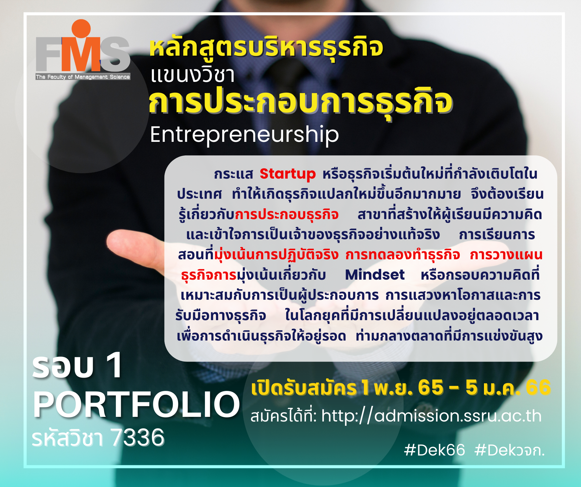 คณะวิทยาการจัดการ มหาวิทยาลัยราชภัฏสวนสุนันทา เปิดรับสมัครนักศึกษาใหม่ #Dek66 ภาคปกติ ระดับปริญญาตรี ประจำปีการศึกษา 2566 (รอบที่ 1 Portfolio)