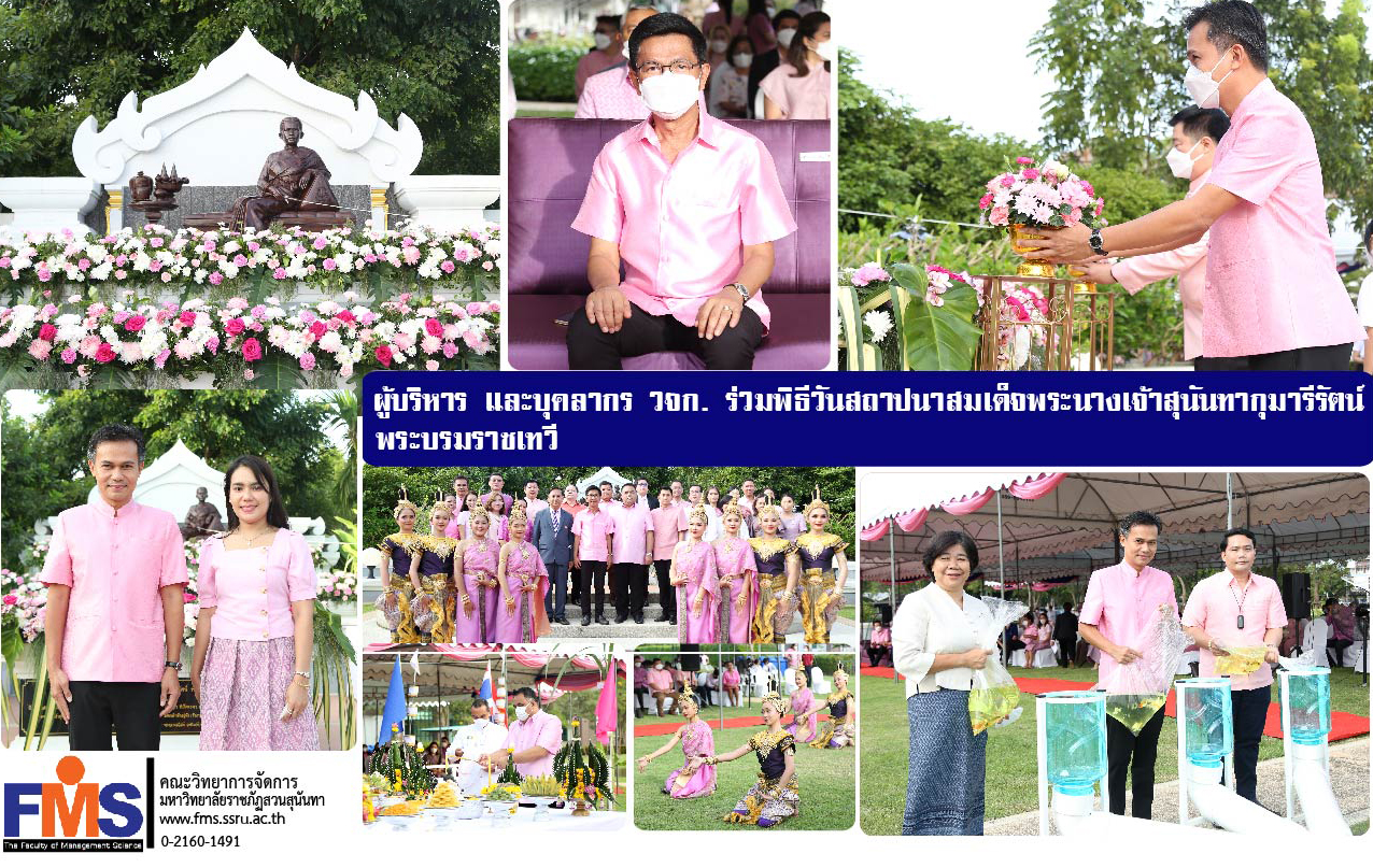 วันที่ 3 ธันวาคม พ.ศ. 2565 เวลา 07.30 น.อาจารย์ปิติมนัส บรรลือ รองคณบดีฝ่ายบริหาร เป็นผู้แทนคณบดีคณะวิทยาการจัดการ พร้อมด้วยนางสาวจิณห์จุฑา ศรีเหรา หัวหน้าสำนักงานคณบดี เข้าร่วมพิธีวันสถาปนาสมเด็จพระนางเจ้าสุนันทากุมารีรัตน์ พระบรมราชเทวี วางพานพุ่มสักการะสมเด็จพระนางเจ้าสุนันทากุมารีรัตน์ฯ และปล่อยปลาเพื่อถวายเป็นพระราชกุศลฯ โดยมีรองศาสตราจารย์ ดร. ฤๅเดช เกิดวิชัย นายกสภามหาวิทยาลัยราชภัฏสวนสุนันทา เป็นประธานในพิธี ณ ลานพระราชานุสาวรีย์สมเด็จพระนางเจ้าสุนันทากุมารีรัตน์ฯ มหาวิทยาลัยราชภัฏสวนสุนันทา วิทยาเขตนครปฐม จังหวัดนครปฐม