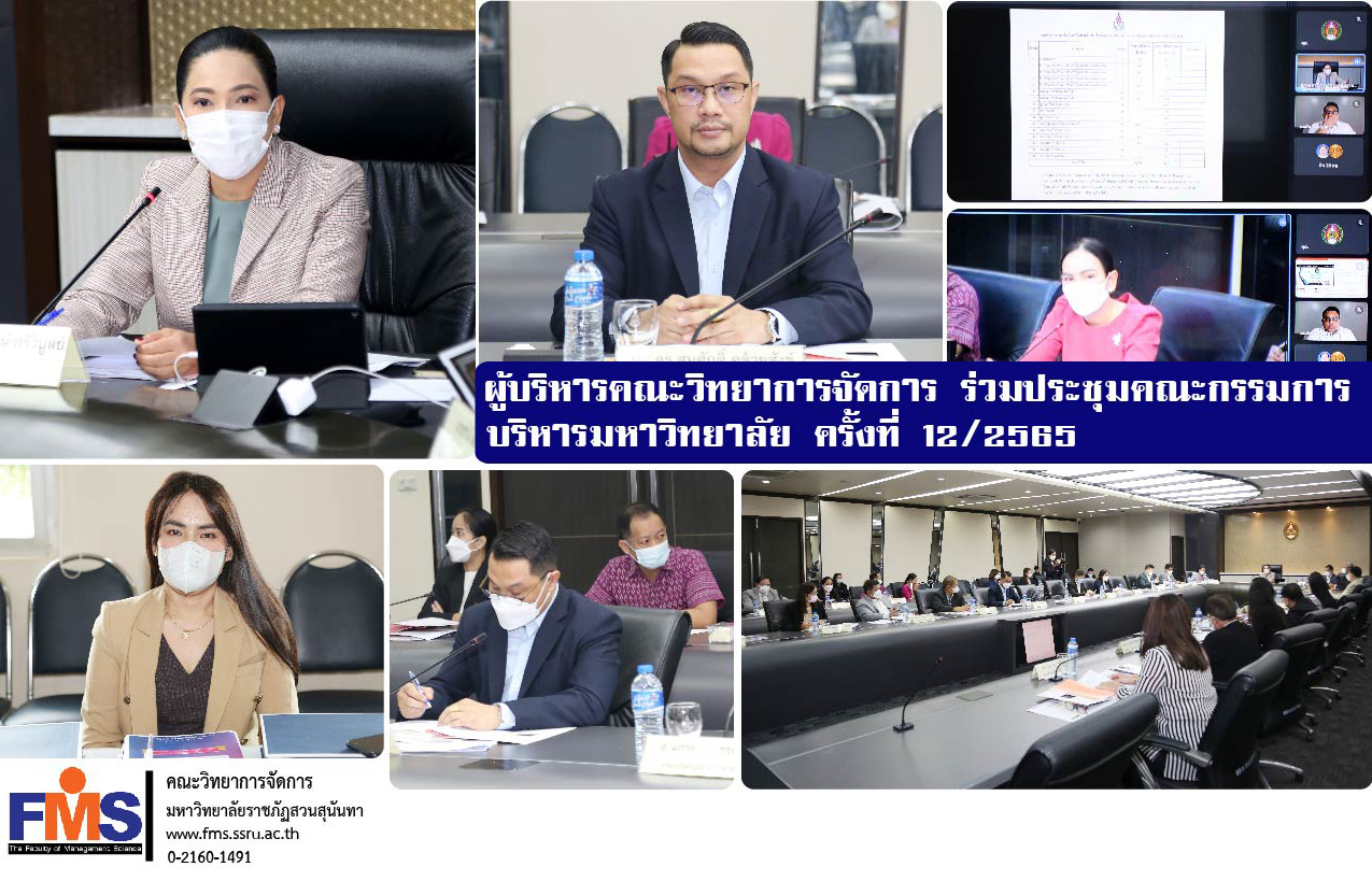วันที่ 13 ธันวาคม 2565 เวลา 09.30 น. ผู้ช่วยศาสตราจารย์ ดร.สมศักดิ์ คล้ายสังข์ คณบดีคณะวิทยาการจัดการ พร้อมด้วยนางสาวจิณห์จุฑา ศรีเหรา หัวหน้าสำนักงานคณบดีคณะวิทยาการจัดการ เข้าร่วมประชุมคณะกรรมการบริหารมหาวิทยาลัย ครั้งที่ 12 /2565 โดยมีรองศาสตราจารย์ ดร. ชุติกาญจน์ ศรีวิบูลย์ อธิการบดีมหาวิทยาลัยราชภัฏสวนสุนันทา เป็นประธานการประชุม มีคณะผู้บริหารมหาวิทยาลัย คณะ หน่วยงาน วิทยาเขต ศูนย์การศึกษา เข้าร่วมประชุม ณ ห้องประชุมสภามหาวิทยาลัย อาคาร 31 ชั้น 5 และการประชุมออนไลน์ด้วยโปรแกรม Google Meet