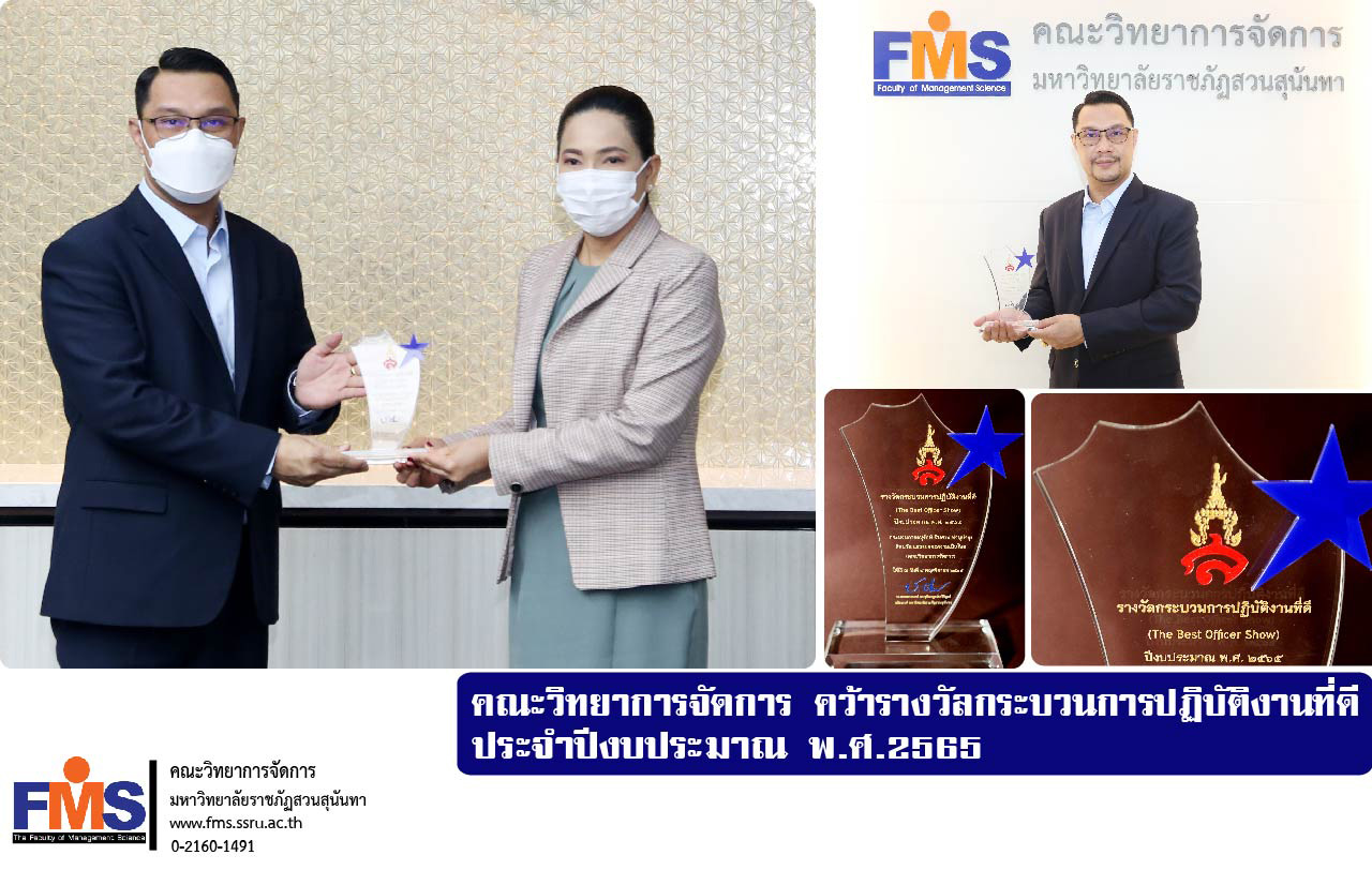 วันที่ 13 ธันวาคม 2565 เวลา 09.30 น. คณะวิทยาการจัดการ มหาวิทยาลัยราชภัฏสวนสุนันทา ได้รับรางวัลกระบวนการปฏิบัติงานที่ดี ประจำปีงบประมาณ พ.ศ.2565 จากผลงานกระบวนการอนุรักษ์ สืบสาน ทำนุบำรุงศิลปวัฒนธรรมและความเป็นไทย โดยผู้ช่วยศาสตราจารย์ ดร.สมศักดิ์ คล้ายสังข์ คณบดีคณะวิทยาการจัดการ เข้ารับรางวัลจากรองศาสตราจารย์ ดร. ชุติกาญจน์ ศรีวิบูลย์ อธิการบดีมหาวิทยาลัยราชภัฏสวนสุนันทา ในการประชุมคณะกรรมการบริหารมหาวิทยาลัย ครั้งที่ 12/2565 ณ ห้องประชุมสภามหาวิทยาลัย อาคาร 31 ชั้น 5