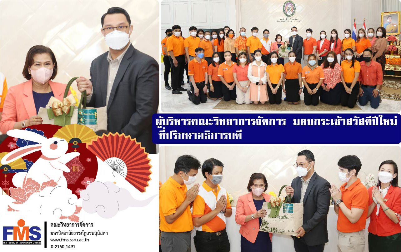 วันที่ 23 ธันวาคม 2565 คณะวิทยาการจัดการ นำโดย ผู้ช่วยศาสตราจารย์ ดร.สมศักดิ์ คล้ายสังข์ คณบดีคณะวิทยาการจัดการ พร้อมด้วยรองคณบดี อาจารย์ หัวหน้าสำนักงานคณบดี และบุคลากรสายสนับสนุนวิชาการ ได้เข้าพบและมอบกระเช้าของขวัญปีใหม่แด่ นางจุณีรัตน์ จันทร์นิตย์ ที่ปรึกษาอธิการบดี เนื่องในโอกาสวันขึ้นปีใหม่ 2566 ณ ห้องรับรองสำนักงานอธิการบดี อาคาร 31 ชั้น 1