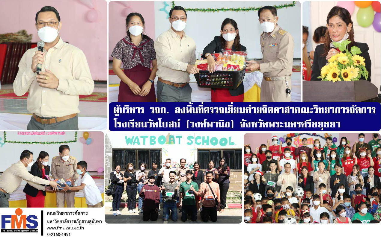 ในโอกาสนี้ผู้ช่วยศาสตราจารย์ ดร.สมศักดิ์ คล้ายสังข์ คณบดีคณะวิทยาการจัดการ ให้กำลังใจแก่นักศึกษาสโมสรนักศึกษาคณะวิทยาการจัดการและคณะผู้ดำเนินการจัดกิจกรรม พร้อมกับมอบเครื่องเขียน อุปกรณ์กีฬา ขนมและเครื่องดื่ม แก่คณะครูและนักเรียน โดยมีนางสาวอังศุธร การสมเนตร์ ผู้อำนวยการโรงเรียนวัดโบสถ์ (วงศ์พานิช) และนายศักดา บุญอร่ามพงษ์ รองนายกองค์การบริหารส่วนตำบลบ้านแพน พร้อมด้วยคณะครูและนักเรียน ให้การต้อนรับอย่างอบอุ่น ซึ่งโครงการดังกล่าวจัดขึ้นระหว่างวันที่ 24-27 ธันวาคม 2565 ณ โรงเรียนวัดโบสถ์ (วงศ์พานิช) ตำบลบ้านแพน อำเภอเสนา จังหวัดพระนครศรีอยุธยา