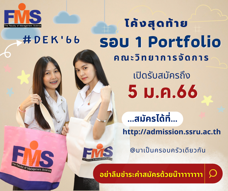 คณะวิทยาการจัดการ มหาวิทยาลัยราชภัฏสวนสุนันทา เปิดรับสมัครนักศึกษาใหม่ #Dek66 ภาคปกติ ระดับปริญญาตรี ประจำปีการศึกษา 2566 (รอบที่ 1 Portfolio)