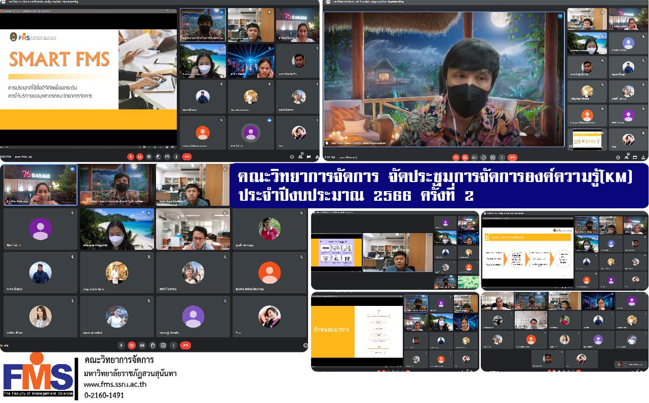 วันที่ 13 มกราคม 2566 คณะวิทยาการจัดการ โดยกลุ่มสมาชิกการจัดการองค์ความรู้ “Smart FMS” จัดประชุมการจัดการองค์ความรู้ (KM) ประจำปีงบประมาณ 2566 ครั้งที่ 2 เพื่อหารือความคืบหน้าการดำเนินกิจกรรม การกำหนดรูปแบบในกิจกรรม การแลกเปลี่ยนแนวคิดการดำเนินกิจกรรมการจัดการองค์ความรู้ และวาระอื่นๆที่เกี่ยวข้อง ก่อนการนำเสนอต่อผู้ทรงคุณวุฒิในครั้งต่อไป มีสมาชิกการจัดการองค์ความรู้ประจำคณะฯ เข้าร่วมประชุม ในรูปแบบการประชุมออนไลน์ Google Meet