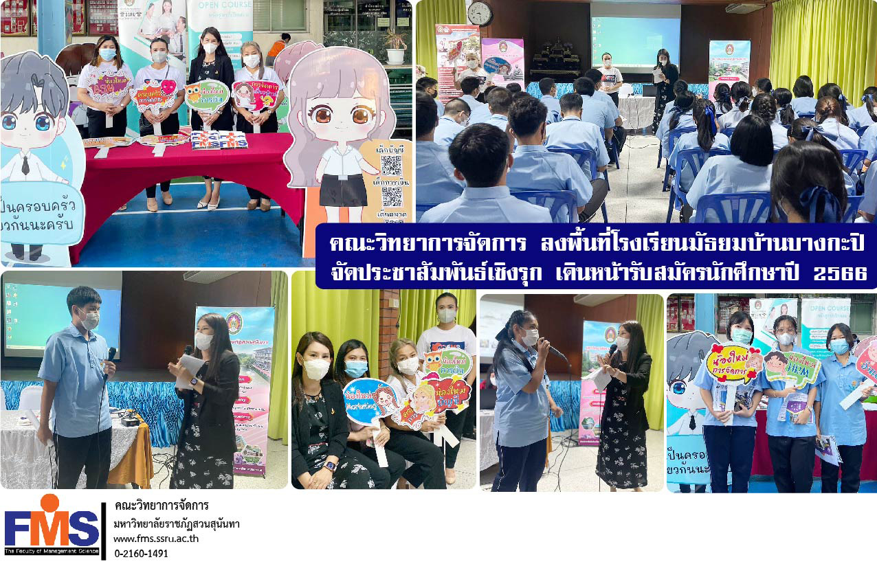 วันที่ 18 มกราคม 2566 คณะวิทยาการจัดการ มหาวิทยาลัยราชภัฏสวนสุนันทา นำโดย ผู้ช่วยศาสตราจารย์.ดร.ณัฐชาฎ์ ผาสุข อาจารย์ประจำแขนงวิชาการเงินการธนาคาร และทีมบุคลากรสายสนับสนุนวิชาการ ลงพื้นที่โรงเรียนมัธยมบ้านบางกะปิ กรุงเทพมหานคร ดำเนินโครงการประชาสัมพันธ์เชิงรุก ตามนโยบายการมุ่งเน้นการประชาสัมพันธ์เชิงรุกของผู้ช่วยศาสตราจารย์ ดร.สมศักดิ์ คล้ายสังข์ คณบดีคณะวิทยาการจัดการ ในประชาสัมพันธ์ข้อมูล แนะแนวการศึกษาต่อ ในคณะวิทยาการจัดการ มหาวิทยาลัยราชภัฏสวนสุนันทา เพื่อเตรียมความพร้อมการรับสมัครนักศึกษาใหม่ ประจำปี 2566 ซึ่งมีคณะครูและนักเรียนให้การต้อนรับอย่างอบอุ่น