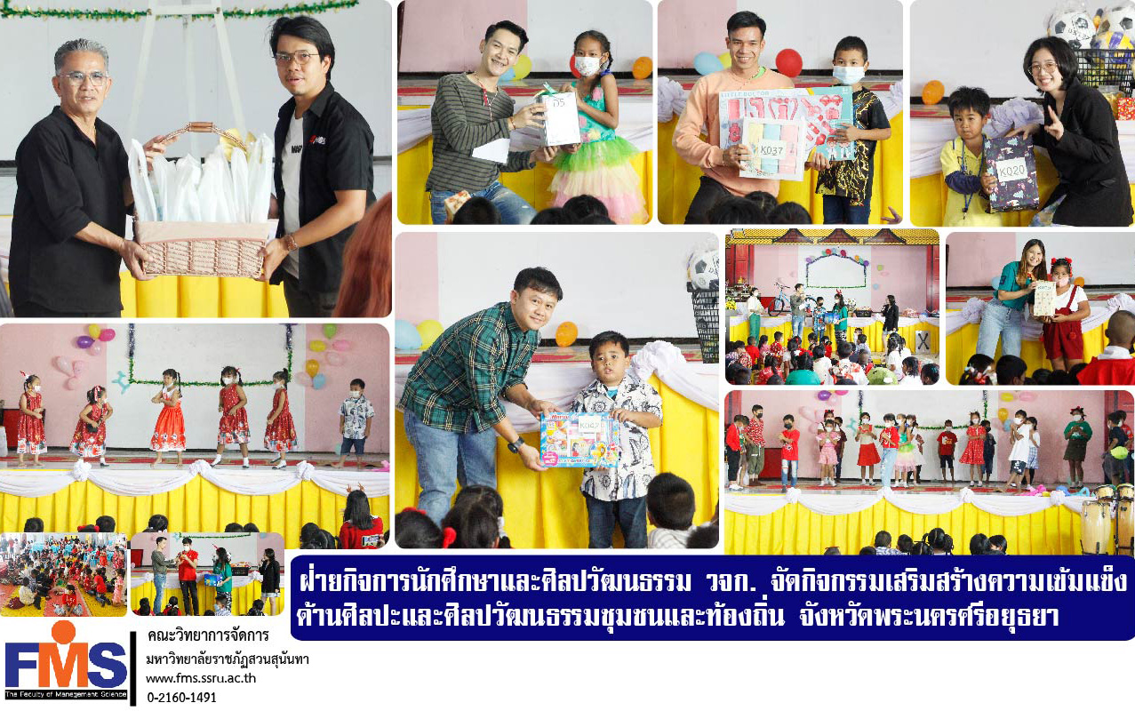 ฝ่ายกิจการนักศึกษาและศิลปวัฒนธรรม คณะวิทยาการจัดการ มหาวิทยาลัยราชภัฏสวนสุนันทา จัดโครงการการเสริมสร้างความเข้มแข็งด้านศิลปะและศิลปวัฒนธรรมชุมชนและท้องถิ่น ประจำปีการศึกษา 2565 ณ โรงเรียนวัดโบสถ์ ตำบลบ้านแพน อำเภอเสนา จังหวัดพระนครศรีอยุธยา โดยอาจารย์ ดร.พงศวีร์ สุภานนท์ รองคณบดีฝ่ายกิจการนักศึกษา นำทีมสโมสรนักศึกษาคณะวิทยาการจัดการ ลงพื้นที่จัดกิจกรรมให้กับเด็กและเยาวชนโรงเรียนวัดโบสถ์เนื่องในวันเด็กแห่งชาติ กิจกรรมประกอบด้วย การละเล่นกีฬาพื้นบ้าน กิจกรรมถามตอบให้ความรู้เชิงวิชาการ รวมทั้งบริการถ่ายรูป และการแสดงบนเวทีของเด็กและเยาวชนโรงเรียนวัดโบสถ์ พร้อมมอบของขวัญของรางวัลมากมาย โดยมีคณะครูให้การต้อนรับคณะผู้จัดกิจกรรมอย่างอบอุ่น พร้อมกับเด็กและเยาวชนโรงเรียนวัดโบสถ์เข้าร่วมกิจกรรมอย่างเต็มที่ บรรยากาศเต็มไปด้วยความสุข รอยยิ้ม และความสนุกสนาน