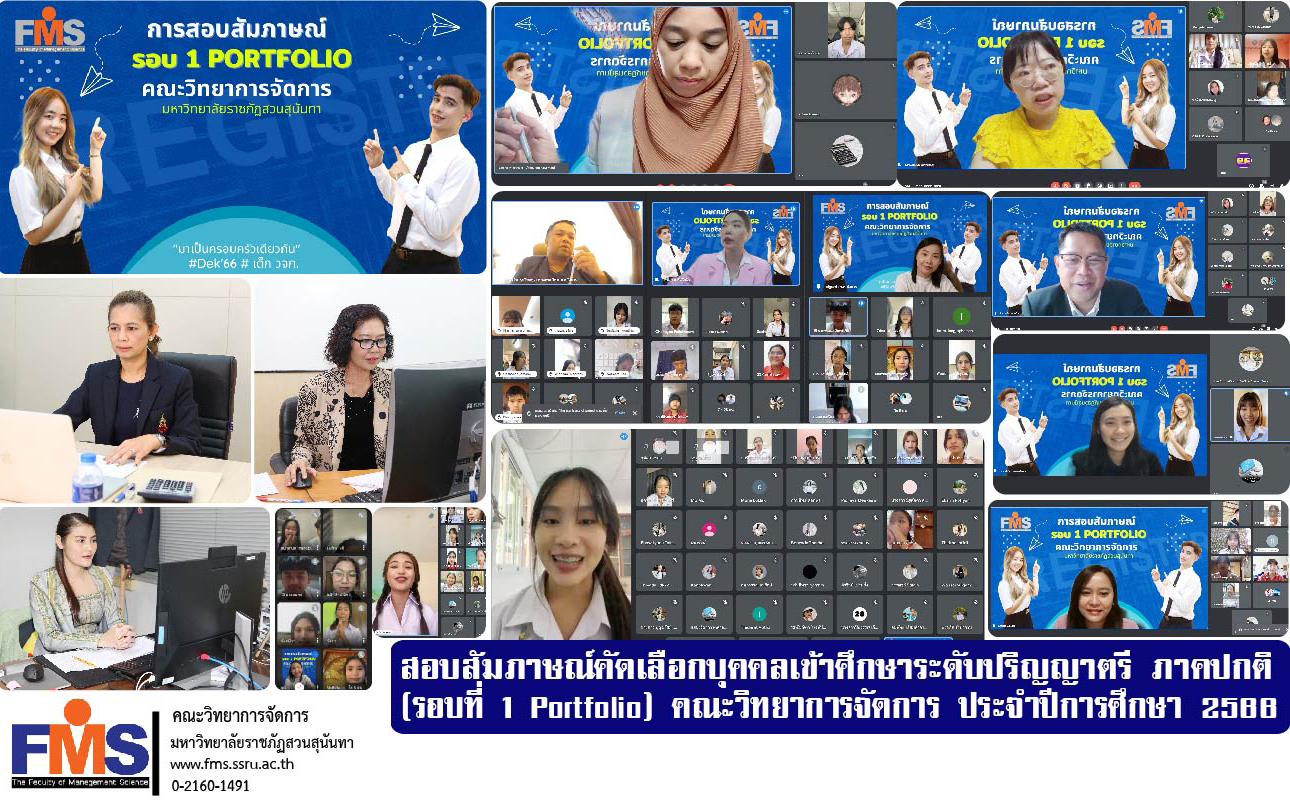 วันที่ 23 มกราคม 2566 มหาวิทยาลัยราชภัฏสวนสุนันทา ดำเนินการจัดสอบสัมภาษณ์คัดเลือกบุคคลเข้าศึกษา ในระดับปริญญาตรี ภาคปกติ ประจำปีการศึกษา 2566 ( รอบ 1 Portfolio) ในรูปแบบออนไลน์  โดยคณะวิทยาการจัดการ มีนักเรียนเข้าสอบสัมภาษณ์ในแต่ละสาขา/แขนงวิชา ได้แก่ สาขาวิชาการบัญชี สาขาวิชาเศรษฐศาสตร์ธุรกิจ กลุ่มสาขาวิชาบริหารธุรกิจ ได้แก่ แขนงวิชาการตลาด แขนงวิชาธุรกิจระหว่างประเทศ แขนงวิชาการบริหารทรัพยากรมนุษย์ แขนงวิชาการเงินการธนาคาร แขนงวิขาการประกอบการธุรกิจ และแขนงวิชาการจัดการธุรกิจบริการ ซึ่งผู้เข้าสอบทุกคนต่างนำความรู้ความสามารถ และผลงาน มานำเสนอต่อคณะกรรมการสอบอย่างเต็มที่ ซึ่งการสอบสัมภาษณ์ผ่านไปด้วยดี ติดตามผลการสอบสัมภาษณ์ และรายละเอียดเพิ่มเติมได้ที่ www.admission.ssru.ac.th