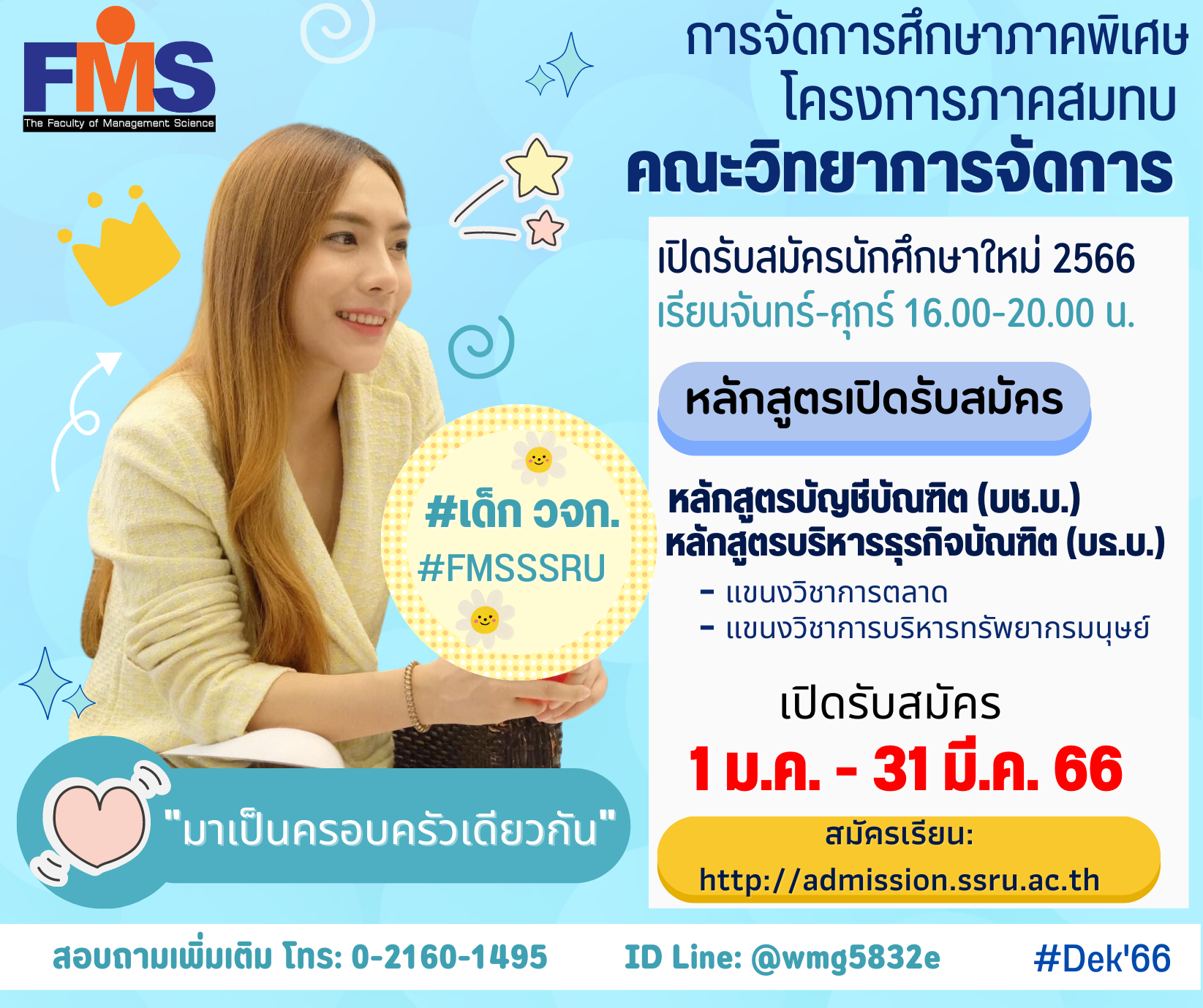 การจัดการศึกษาภาคพิเศษ โครงการภาคสมทบ คณะวิทยาการจัดการ มหาวิทยาลัยราชภัฏสวนสุนันทา เปิดรับสมัครนักศึกษาใหม่ ประจำปีการศึกษา 2566 เรียนจันทร์-วันศุกร์ เวลา 16.00-20.00 น.