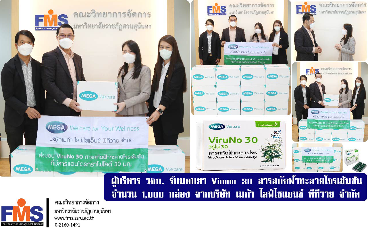 ในนามของผู้บริหาร คณาจารย์ บุคลากร และนักศึกษา คณะวิทยาการจัดการ มหาวิทยาลัยราชภัฏสวนสุนันทา ขอขอบคุณ บริษัท เมก้า ไลฟ์ไซแอ็นซ์ พีทีวาย จำกัด ทั้งนี้ ผลิตภัณฑ์ดังกล่าว ทางคณะวิทยาการจัดการ จะมอบให้แก่ผู้บริหาร อาจารย์ บุคลากร และนักศึกษาได้ใช้ประโยชน์ในการดูแลสุขภาพเพื่อป้องกันและบรรเทาอาการ กรณีติดเชื้อไวรัสโควิด-19 แบบไม่รุนแรงต่อไป