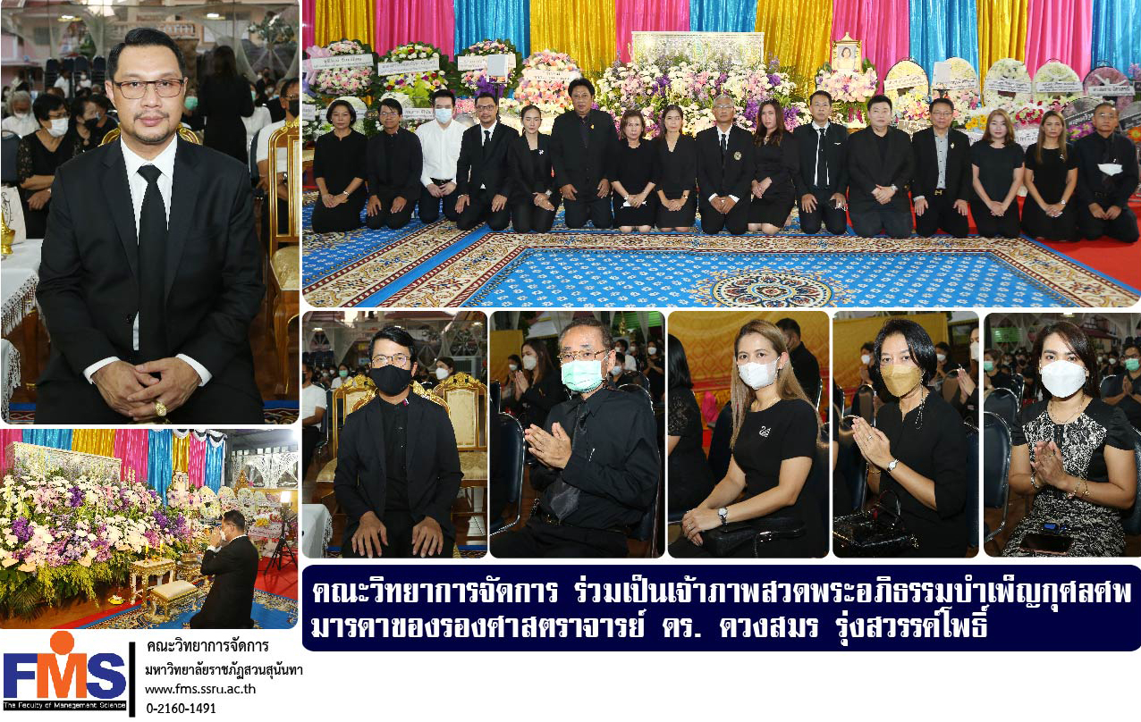 เมื่อวันที่ 18 กุมภาพันธ์ 2566 เวลา 18.30 น. คณะวิทยาการจัดการ นำโดยผู้ช่วยศาสตราจารย์ ดร.สมศักดิ์ คล้ายสังข์ คณบดีคณะวิทยาการจัดการ ร่วมเป็นเจ้าภาพในงานสวดพระอภิธรรมบำเพ็ญกุศลศพ มารดาของรองศาสตราจารย์ ดร.ดวงสมร รุ่งสวรรค์โพธิ์ คณบดีบัณฑิตวิทยาลัย มหาวิทยาลัยราชภัฏสวนสุนันทา โดยมีรองคณบดี อาจารย์ หัวหน้าสำนักงานคณบดี และบุคลากรสายสนับสนุนวิชาการประจำคณะ ร่วมพิธีสวดพระอภิธรรมบำเพ็ญกุศล ณ ศาลาโดมอเนกประสงค์ วัดบ่อ อำเภอปากเกร็ด จังหวัดนนทบุรี