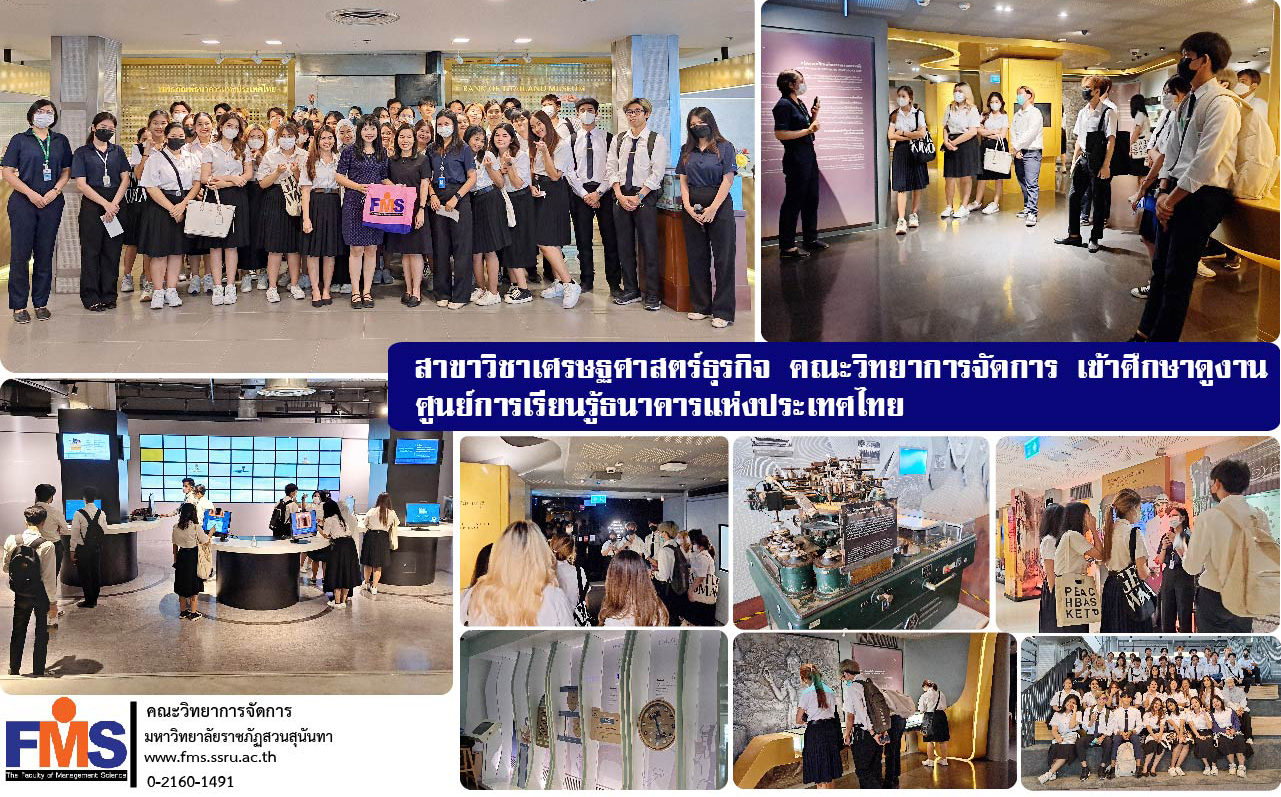 เมื่อเร็วๆนี้ ผู้ช่วยศาสตราจารย์ ดร.ศิริวรรณ ศักดิ์ศิริฤทัย หัวหน้าสาขาวิชาเศรษฐศาสตร์ธุรกิจ และอาจารย์ ดร. พิทยา กลองกระโทก อาจารย์ประจำสาขาวิชาเศรษฐศาสตร์ธุรกิจ คณะวิทยาการจัดการ นำทีมนักศึกษาสาขาวิชาเศรษฐศาสตร์ธุรกิจชั้นปีที่ 2 และ 3 เข้าศึกษาดูงาน ณ ศูนย์การเรียนรู้ธนาคารแห่งประเทศไทย กรุงเทพมหานคร สำหรับการจัดกิจกรรมดังกล่าว มีวัตถุประสงค์เพื่อให้นักศึกษาได้รับประสบการณ์ที่ดี จากการเรียนรู้นอกสถานที่ รวมทั้งได้รับแรงบันดาลใจ และความบันเทิงจากการศึกษาดูงาน ทัศนศึกษาเป็นหมู่คณะ กิจกรรมประกอบด้วย การเข้าชมนิทรรศการโรงพิมพ์ธนบัตร และเครื่องพิมพ์ธนบัตรรุ่นแรกของประเทศไทย นิทรรศการเงินตรา ศึกษาประวัติการใช้เงินตราตั้งแต่สมัยโบราณ และการเข้าชมนิทรรศการบทบาทหน้าที่ธนาคารแห่งประเทศไทย และนิทรรศการส่งเสริมความรู้ด้านการเงิน โดยได้รับความอนุเคราะห์จากวิทยากรประจำศูนย์ ให้ความรู้แก่นักศึกษา พร้อมกิจกรรมการเล่นเกมตอบคำถามมากมาย