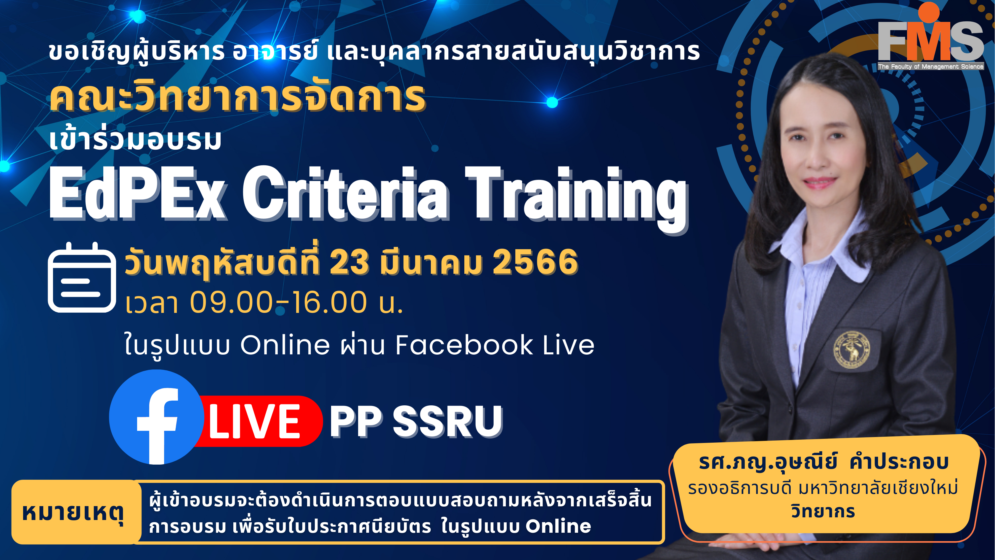 ขอเชิญผู้บริหาร อาจารย์ และบุคลากรสายสนับสนุนวิชาการ คณะวิทยาการจัดการ เข้าร่วมอบรม หัวข้อ EdPEx Criteria Training ในรูปแบบ Online