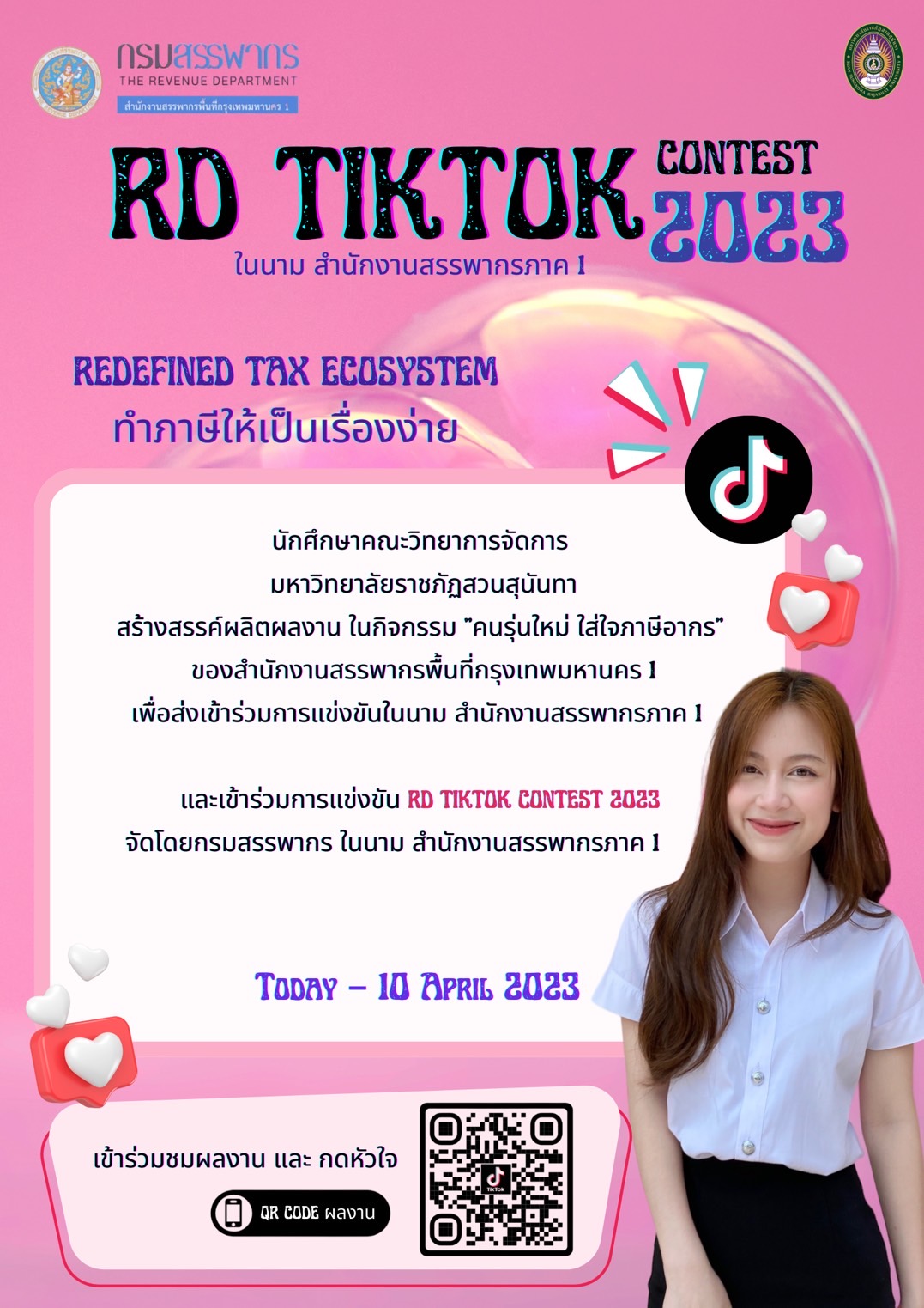กรมสรรพากร ได้จัดกิจกรรม RD TikTok Contest 2023 เป็นกิจกรรมที่ จัดทำคลิปเผยแพร่ หัวข้อ ทำภาษีให้เป็นเรื่องง่าย (REDEFINED TAX ECOSTSYSTEM) โดยนักศึกษาคณะวิทยาการจัดการ ดำเนินการสร้างสรรค์ผลิตผลงาน ในกิจกรรม “คน-รุ่นใหม่ ใส่ใจภาษีอากร” ของสำนักงานสรรพากรพื้นที่กรุงเทพมหานคร 1 เพื่อส่งเข้าร่วมการแข่งขันในนาม สำนักงานสรรพากรภาค 1