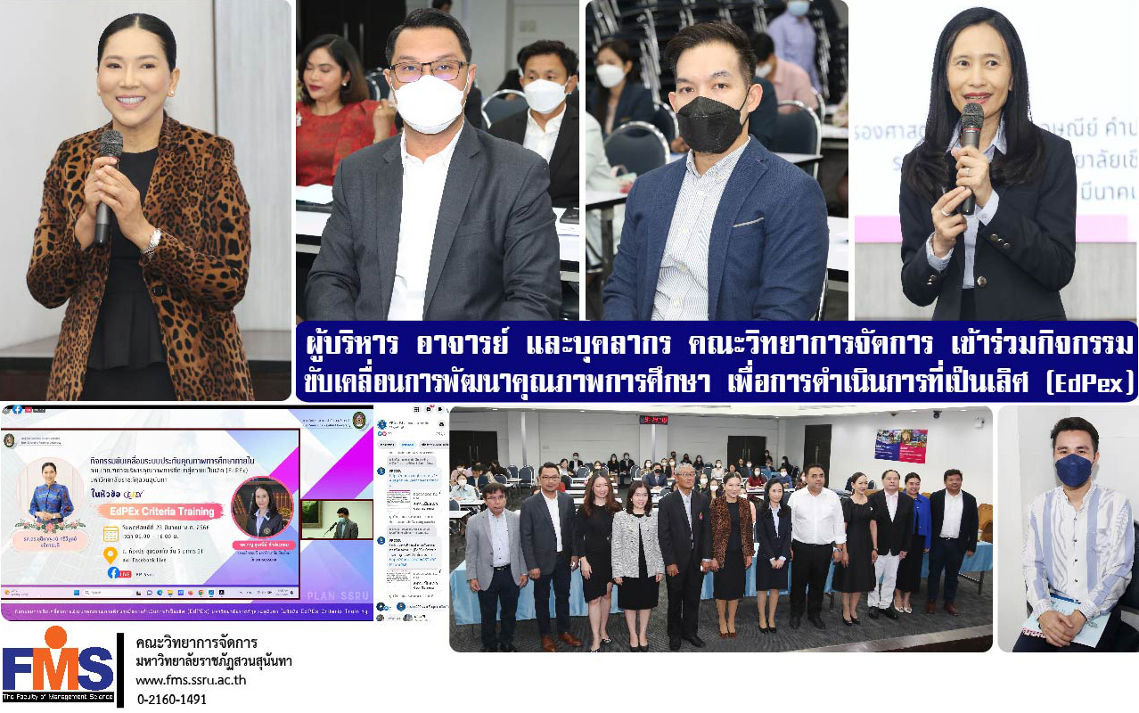 วันที่ 23 มีนาคม พ.ศ. 2566 ผู้ช่วยศาสตราจารย์ ดร.สมศักดิ์ คล้ายสังข์ คณบดีคณะวิทยาการจัดการ พร้อมด้วย อาจารย์ ดร.อิทธิภูมิ พรหมมา รองคณบดีฝ่ายแผนงานและประกันคุณภาพ นายฉัตรลิขิต นิ่มงาม บุคลากรฝ่ายแผนงานและประกันคุณภาพ อาจารย์และบุคลากรคณะวิทยาการจัดการ เข้าร่วมกิจกรรมขับเคลื่อนการพัฒนาคุณภาพการศึกษาเพื่อการดำเนินการที่เป็นเลิศ (EdPex) มหาวิทยาลัยราชภัฏสวนสุนันทา จัดโดยกองนโยบายและแผน โดยรองศาสตราจารย์ ดร.ชุติกาญจน์ ศรีวิบูลย์ อธิการบดีมหาวิทยาลัยราชภัฏสวนสุนันทา เป็นประธานกล่าวเปิดกิจกรรมฯ ซึ่งได้รับเกียรติจาก รองศาสตราจารย์ ภญ.อุษณีย์ คำประกอบ รองอธิการบดีมหาวิทยาลัยราชภัฏเชียงใหม่ เป็นวิทยากรการอบรมในหัวข้อ "EdPex Criteria Tyaining" ณ ห้องประชุมช่อแก้ว อาคาร 31 ชั้น 5 และการอบรมในรูปแบบออนไลน์ผ่านทาง Facebook Live PP SSRU
