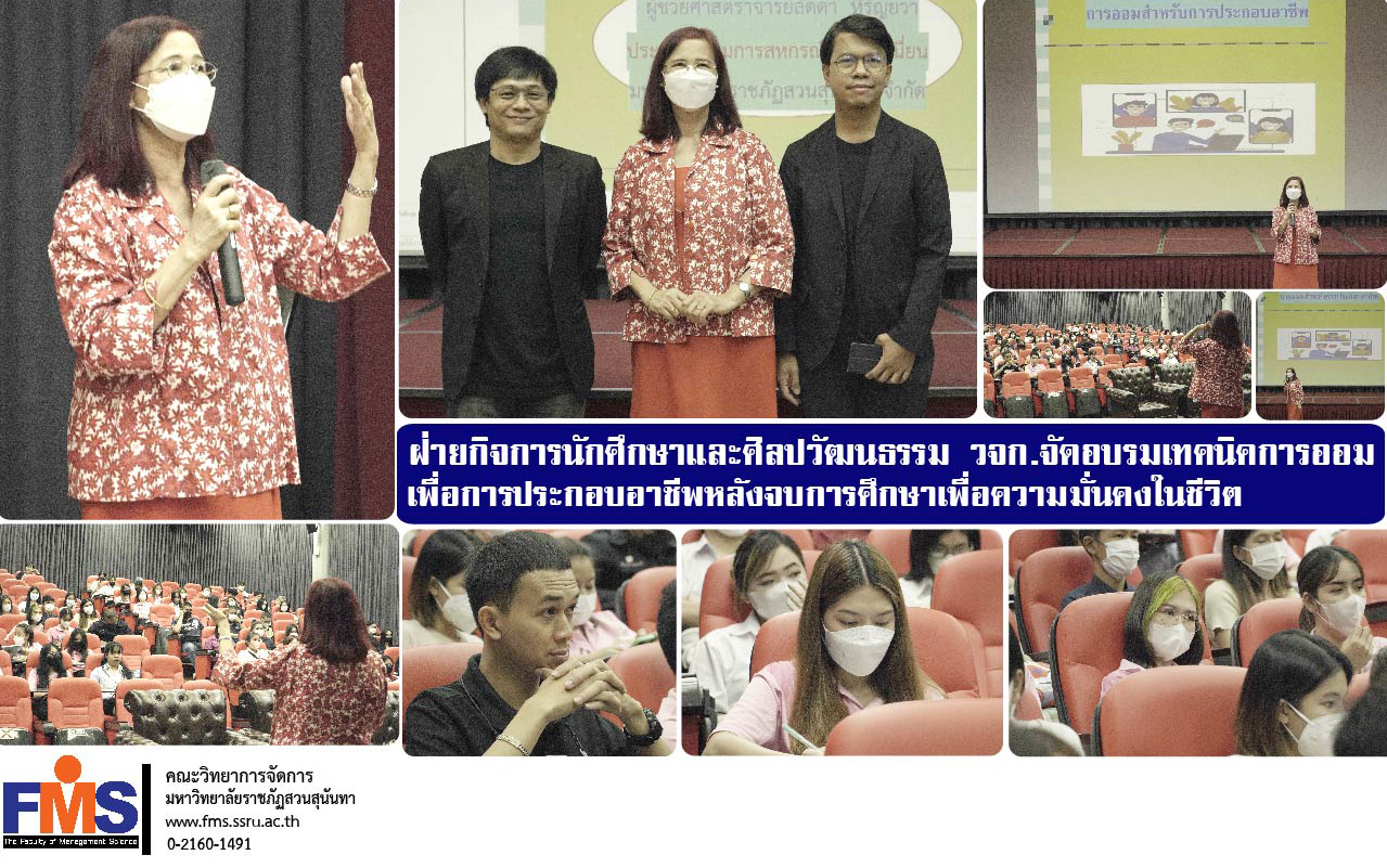 ฝ่ายกิจการนักศึกษาและศิลปวัฒนธรรม คณะวิทยาการจัดการ มหาวิทยาลัยราชภัฏสวนสุนันทา จัดโครงการอบรมเทคนิคการออมเพื่อการประกอบอาชีพหลังจบการศึกษาเพื่อความมั่นคงในชีวิต มีวัตถุประสค์จัดขึ้น เพื่อให้นักศึกษาได้รับองค์ความรู้เกี่ยวกับแนวทางการออมและการประกอบอาชีพหลังจบการศึกษา โดยอาจารย์ ดร.พงศวีร์ สุภานนท์ รองคณบดีฝ่ายกิจการนักศึกษา เป็นประธานเปิดการอบรม และได้รับเกียรติจากผู้ช่วยศาสตราจารย์ลัดดา หิรัญยวา ประธานกรรมการสหกรณ์เครดิตยูเนี่ยน มหาวิทยาลัยราชภัฏสวนสุนันทา จำกัด เป็นวิทยากรบรรยายให้ความรู้ หัวข้อ ความสำคัญของการออม และการประกอบอาชีพในยุค 4.0 มีนักศึกษาคณะวิทยาการจัดการชั้นปีที่ 4 เข้าร่วมอบรม ณ ห้องมินิเธียเตอร์ อาคาร 57 คณะวิทยาการจัดการ