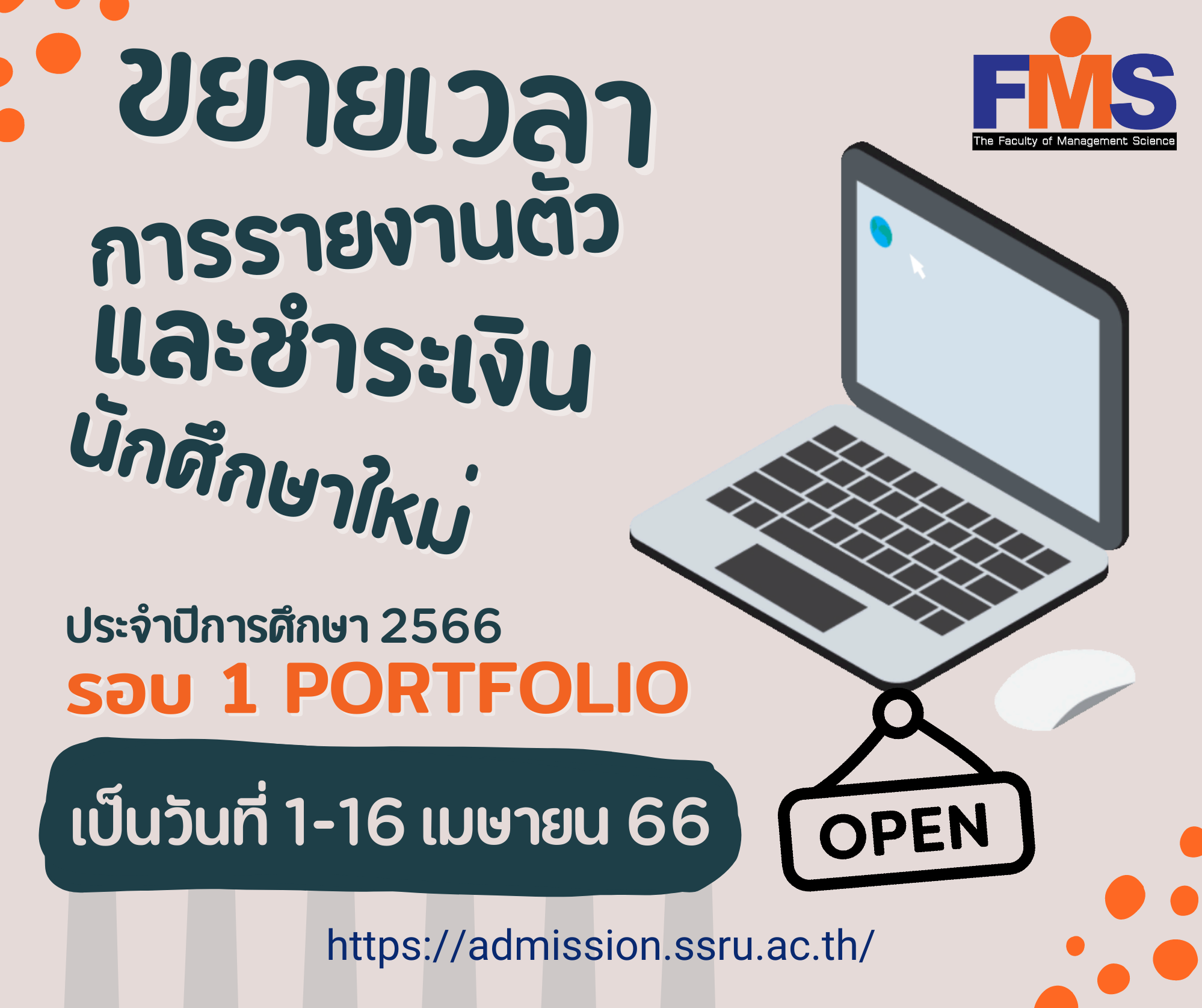 ประชาสัมพันธ์ ขยายเวลาการรายงานตัวและชำระเงินนักศึกษาใหม่ ประจำปีการศึกษา 2566 รอบ 1 Portfolio