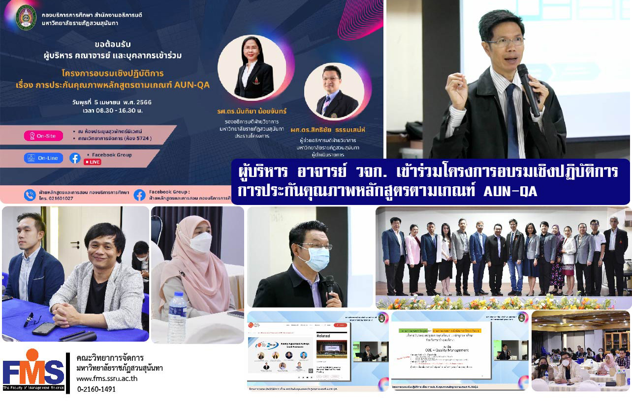 วันที่ 5 กุมภาพันธ์ 2566 ผู้บริหาร พร้อมด้วยอาจารย์คณะวิทยาการ เข้าร่วมโครงการอบรมเชิงปฏิบัติการ เรื่อง การประกันคุณภาพหลักสูตรตามเกณฑ์ AUN-QA จัดโดยฝ่ายหลักสูตรและการสอน กองบริการการศึกษา เพื่อให้ผู้เข้าร่วมอบรมมีความรู้ความเข้าใจในสาระของเกณฑ์ AUN-QA และใช้แนวคิดจากเกณฑ์ AUN-QA จัดทำแผนพัฒนา/บริหารจัดการหลักสูตรและการจัดการเรียนการสอนได้อย่างสอดคล้องได้ โดยมีรองศาสตราจารย์ ดร.นันทิยา น้อยจันทร์ รองอธิการบดีฝ่ายวิชาการ เป็นประธานโครงการอบรม