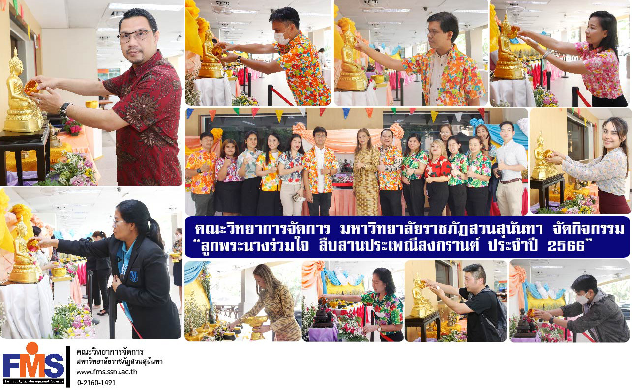เมื่อวันที่ 5 เมษายน 2566 ฝ่ายกิจการนักศึกษาและศิลปวัฒนธรรม คณะวิทยาการจัดการ มหาวิทยาลัยราชภัฏสวนสุนันทา จัดงานสืบสานประเพณีสงกรานต์ ภายใต้ชื่อ “ลูกพระนางร่วมใจ สืบสานประเพณีสงกรานต์ 2566” โดยผู้ช่วยศาสตราจารย์ ดร.สมศักดิ์ คล้ายสังข์ คณบดีคณะวิทยาการจัดการ เป็นประธานในพิธี มีผู้บริหาร อาจารย์ บุคลากรสายสนับสนุนวิชาการ แขกผู้มีเกียรติ และนักศึกษามหาวิทยาลัยราชภัฏสวนสุนันทา เข้าร่วมกิจกรรม และได้รับเกียรติจากผู้บริหาร บุคลากร คณะศึกษาดูงาน คณะวิทยาการจัดการ มหาวิทยาลัยราชภัฏสุราษฎร์ธานี เข้าร่วมกิจกรรมอีกด้วย ณ ลานอเนกประสงค์อาคาร 56 คณะวิทยาการจัดการ มหาวิทยาลัยราชภัฏสวนสุนันทา