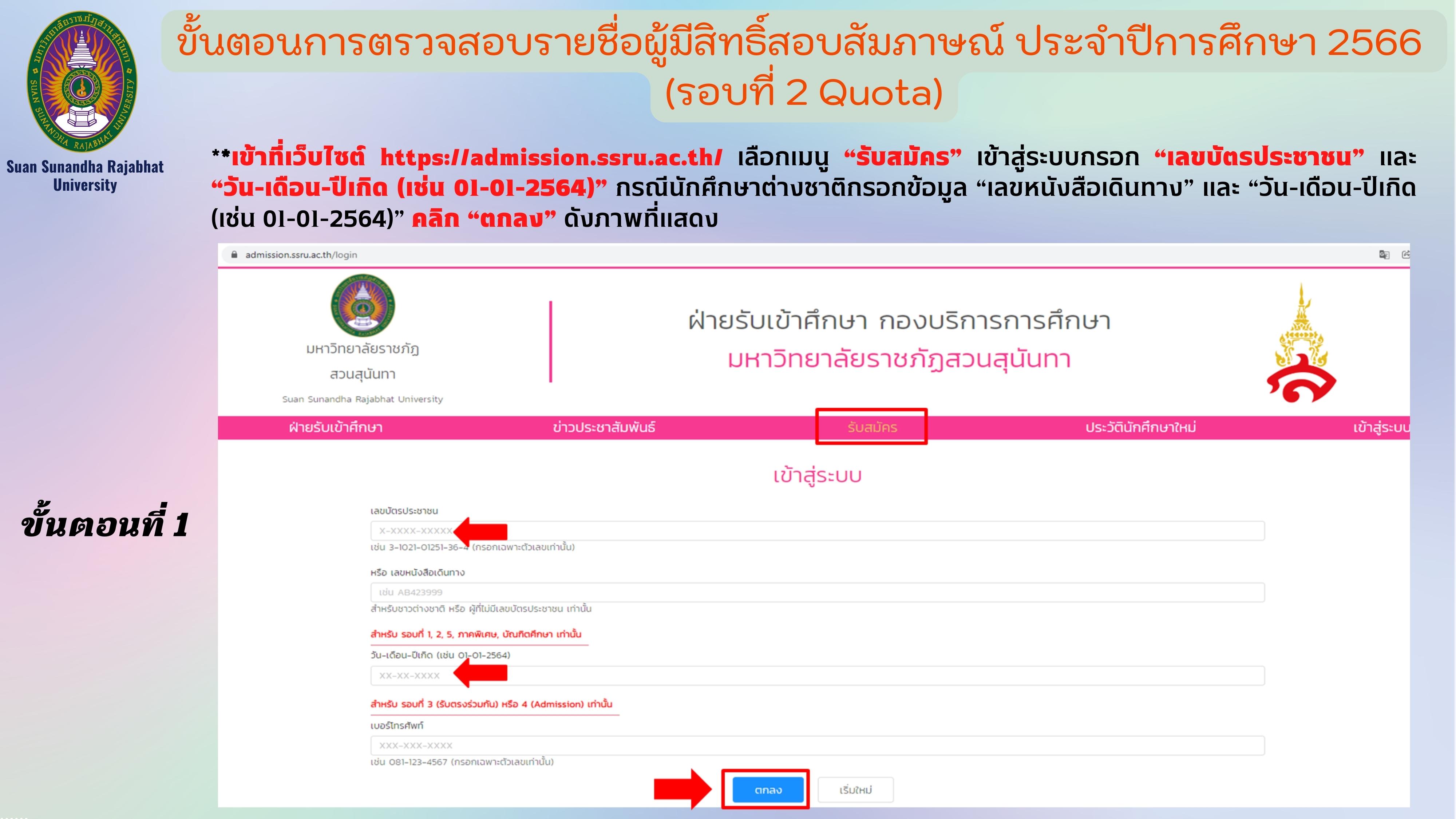 ขั้นตอนการตรวจสอบรายชื่อผู้มีสิทธิ์สอบสัมภาษณ์ ภาคปกติ ระดับปริญญาตรี ประจำปีการศึกษา 2566 (รอบที่ 2 Quota) สามารถตรวจสอบได้ที่เว็บไซต์ https://admission.ssru.ac.th/login