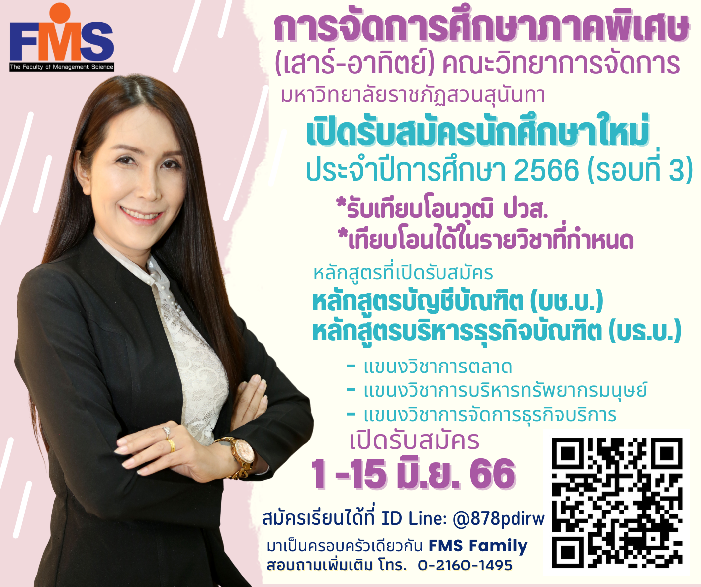 การจัดการศึกษาภาคพิเศษ (เสาร์-อาทิตย์) คณะวิทยาการจัดการ มหาวิทยาลัยราชภัฏสวนสุนันทา เปิดรับสมัครนักศึกษาใหม่ ประจำปีการศึกษา 2566 (รอบที่ 3)