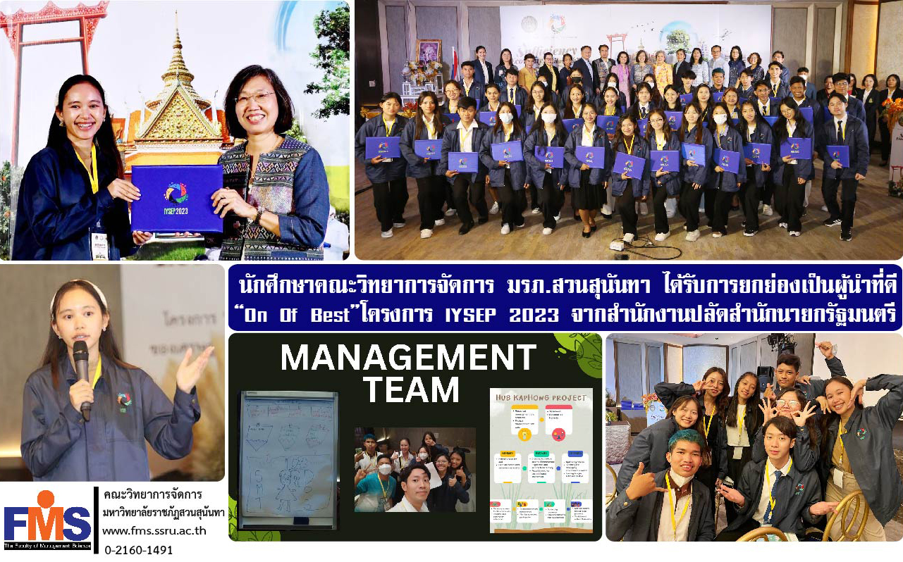 เมื่อวันที่ 29 พฤษภาคม - 4 มิถุนายน 2566 ตัวแทนนักศึกษานานาชาติ คณะวิทยาการจัดการ มหาวิทยาลัยราชภัฏสวนสุนันทา เข้าร่วมโครงการเยาวชนนักศึกษานานาชาติเรียนรู้หลักปรัชญาของเศรษฐกิจพอเพียงสืบสานตามรอยพระยุคลบาท “The International Youth Representatives in Experiencing the Sufficiency Economy Philosophy (IYSEP 2023)” จัดโดย สำนักงานปลัดสำนักนายกรัฐมนตรี โดย Ms. Kyle Andrea Hufanda (Andrea) นักศึกษาชั้นปี 3 สาขาวิชาการบริหารทรัพยากรมนุษย์ คณะวิทยาการจัดการ ได้รับยกย่องให้เป็น One of Best คือ มีความเป็นผู้นำที่ดี มีความกระตือรือร้น อ่อนน้อม ถ่อมตน สามารถสร้างแรงกระตุ้นและแรงจูงใจช่วยเหลือเพื่อนร่วมทีมส่งผลให้เกิดความร่วมมือและทำให้กิจกรรมสำเร็จลุล่วงไปได้ด้วยดี พร้อมทั้งกล่าวแสดงความรู้สึกในโอกาสได้รับคัดเลือกให้เข้าร่วมโครงการได้รับการยกย่องเป็นผู้นำที่ดี “On Of Best” ในครั้งนี้ว่า