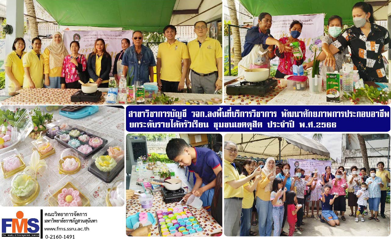 เมื่อวันที่ 11 มิถุนายน 2566 ที่ผ่านมา สาขาวิชาการบัญชี คณะวิทยาการจัดการ นำโดยอาจารย์ ดร.หุดา วงษ์ยิ้ม หัวหน้าสาขาวิชาการบัญชี พร้อมด้วยอาจารย์ประจำสาขาวิชาการบัญชี ลงพื้นที่ดำเนินโครงการบริการวิชาการพัฒนาศักยภาพการประกอบอาชีพ สาธิตวิธีทำและเทคนิคการทำขนมไทย เพื่อยกระดับรายได้ครัวเรือน (ยุทธศาสตร์ราชภัฏ) ประจำปี พ.ศ.2566 ณ ลานเอนกประสงค์ ชุมชนตรอกต้นโพธิ์ เขตดุสิต กรุงเทพมหานคร