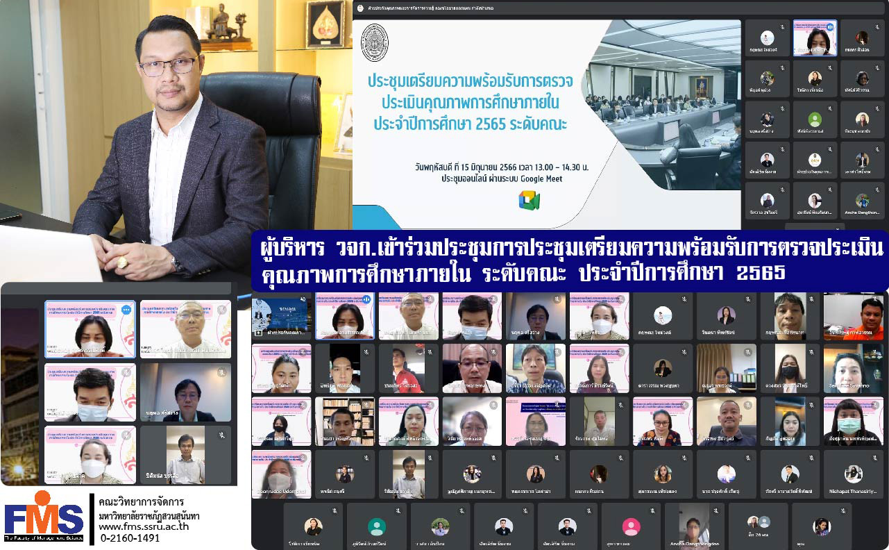 วันที่ 15 มิถุนายน 2566 เวลา 13.00 น. ผู้ช่วยศาสตราจารย์ ดร.สมศักดิ์ คล้ายสังข์ คณบดีคณะวิทยาการจัดการ พร้อมด้วยรองคณบดี และบุคลากรฝ่ายแผนงานและประกันคุณภาพ เข้าร่วมประชุมเตรียมความพร้อมรับการตรวจประเมินคุณภาพการศึกษาภายใน ระดับคณะ ประจำปีการศึกษา 2565 โดยมีรองศาสตราจารย์ ดร.วิทยา เมฆขำ รองอธิการบดีฝ่ายแผนงานและประกันคุณภาพ เป็นประธานการประชุม มีผู้บริหารคณะ และบุคลากรที่เกี่ยวข้องเข้าร่วมประชุม ในรูปแบบออนไลน์ด้วยโปรแกรม Google Meet