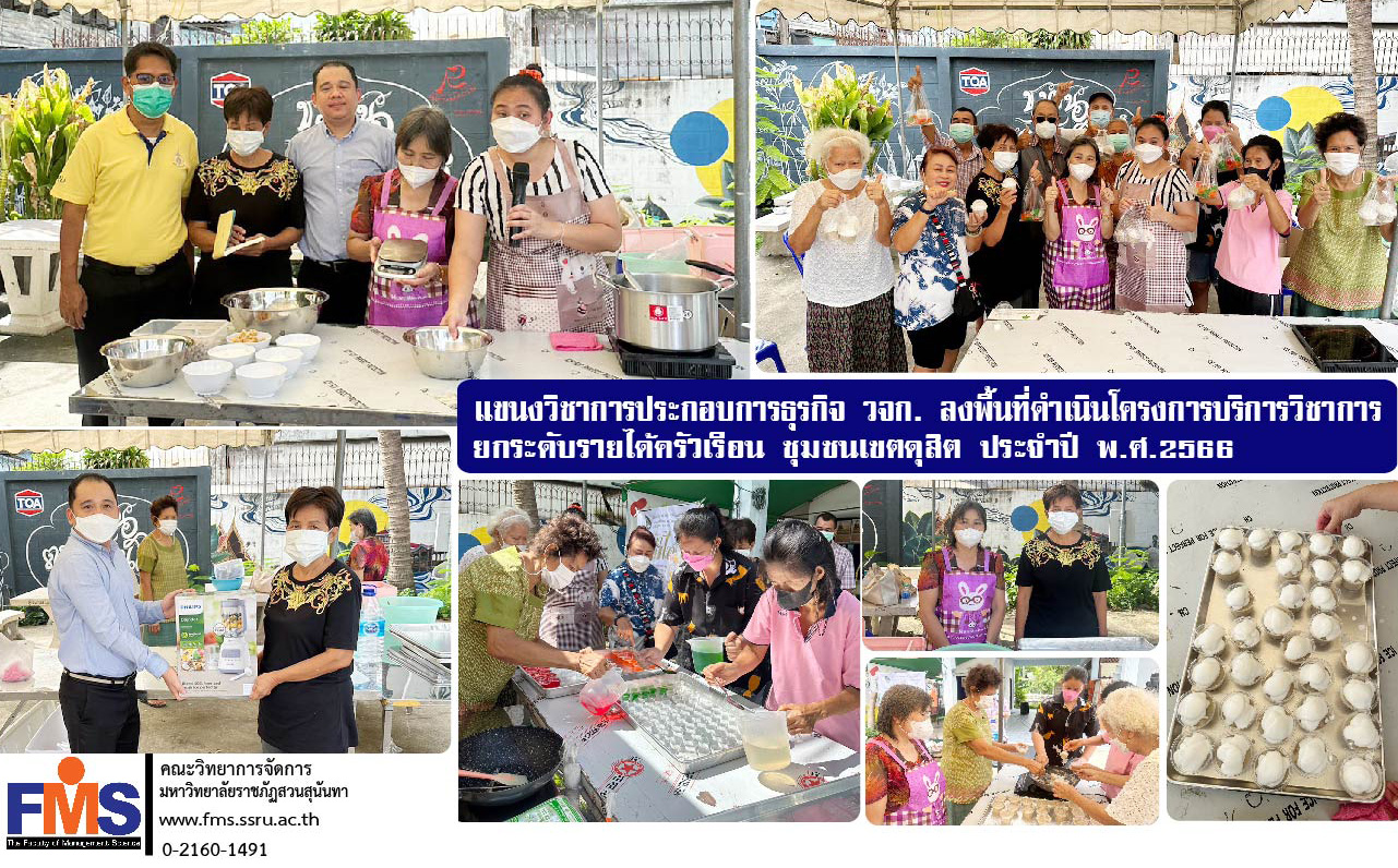 แขนงวิชาการประกอบการธุรกิจ คณะวิทยาการจัดการ นำโดยผู้ช่วยศาสตราจารย์ ดร.พิสิษฐ์ พจนจารุวิทย์ หัวหน้าแขนงวิชาการประกอบการธุรกิจ ลงพื้นที่ดำเนินโครงการบริการวิชาการสาธิตวิธีทำและเทคนิคการทำขนมไทย เพื่อยกระดับรายได้ครัวเรือน (ยุทธศาสตร์ราชภัฏ) ประจำปี พ.ศ.2566 ณ อาคารอเนกประสงค์ ชุมชนตรอกต้นโพธิ์ เขตดุสิต กรุงเทพมหานคร