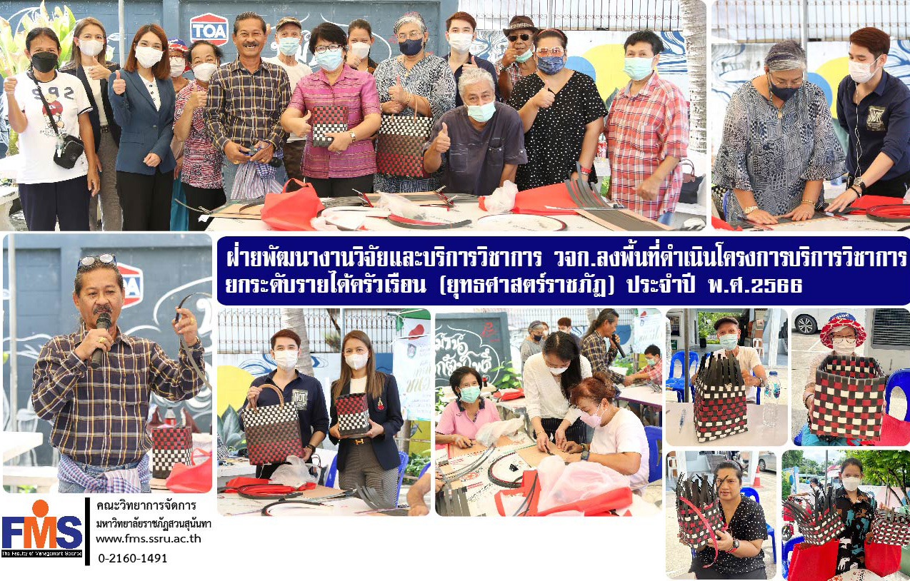 ฝ่ายพัฒนางานวิจัยและบริการวิชาการ คณะวิทยาการจัดการ มหาวิทยาลัยราชภัฏสวนสุนันทา นำโดยผู้ช่วยศาสตราจารย์ ดร. ณัฐพงษ์ เตชะรัตนเสฏฐ์ รองคณบดีฝ่ายวิจัยและบริการวิชาการ พร้อมด้วยบุคลากรฝ่ายพัฒนางานวิจัยและบริการวิชาการ ลงพื้นที่ดำเนินโครงการบริการวิชาการสาธิตวิธีการทำตะกร้าจักสาน เพื่อยกระดับรายได้ครัวเรือน (ยุทธศาสตร์ราชภัฏ) ประจำปี พ.ศ.2566 ณ อาคารอเนกประสงค์ ชุมชนตรอกต้นโพธิ์ เขตดุสิต กรุงเทพมหานคร