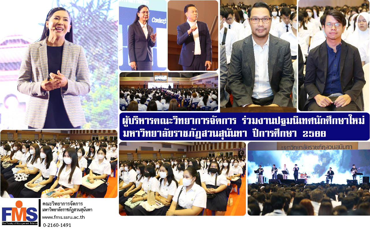 วันที่ 3 กรกฎาคม 2566 เวลา 10.30 น. ผู้ช่วยศาสตราจารย์ ดร.สมศักดิ์ คล้ายสังข์ คณบดีคณะวิทยาการจัดการพร้อมด้วยอาจารย์ ดร.พงศวีร์ สุภานนท์ รองคณบดีฝ่ายกิจการนักศึกษา เข้าร่วมงานปฐมนิเทศนักศึกษาใหม่ ปีการศึกษา 2566 มหาวิทยาลัยราชภัฏสวนสุนันทา "SSRU Smart Digital University" โดยรองศาสตราจารย์ ดร.ชุติกาญจน์ ศรีวิบูลย์ อธิการบดีมหาวิทยาลัยราชภัฏสวนสุนันทา พร้อมด้วยรองอธิการบดี กล่าวต้อนรับและให้โอวาทแก่นักศึกษาใหม่ ณ อาคารอาคารศูนย์สุขภาพและกีฬา ชั้น 4