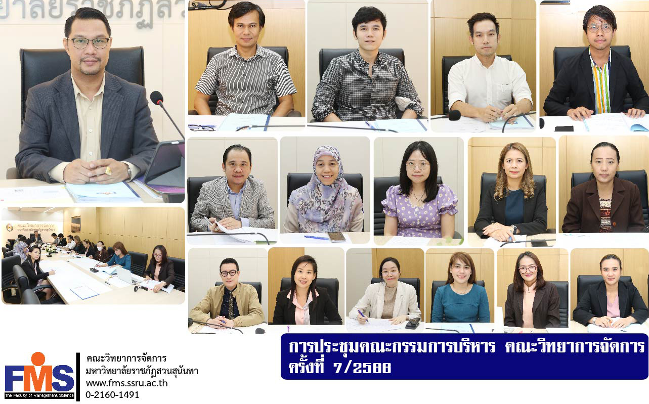 วันที่ 21 กรกฎาคม 2566 เวลา 09.30 น. คณะวิทยาการจัดการ มหาวิทยาลัยราชภัฏสวนสุนันทา จัดประชุมคณะกรรมการบริหารคณะ ครั้งที่ 7 /2566 โดยผู้ช่วยศาสตราจารย์ ดร.สมศักดิ์ คล้ายสังข์ คณบดีคณะวิทยาการจัดการ เป็นประธานการประชุม พร้อมด้วยรองคณบดี หัวหน้ากลุ่มสาขาวิชาบริหารธุรกิจ หัวหน้าสาขาวิชา หัวหน้าแขนงวิชา หัวหน้าสำนักงานคณบดี และหัวหน้าฝ่ายบริหารงานทั่วไป เข้าร่วมประชุม ณ ห้องประชุมรวมใจการจัดการ