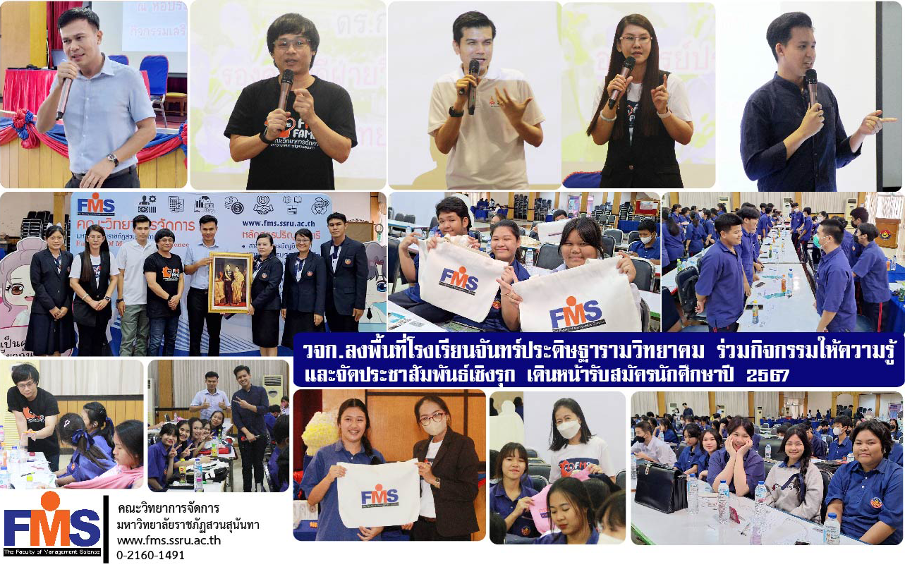 เมื่อวันที่ 25 กรกฎาคม 2566 คณะวิทยาการจัดการ มหาวิทยาลัยราชภัฏสวนสุนันทา นำโดย อาจารย์ ดร.ปิติมนัส บรรลือ รองคณบดีฝ่ายบริหาร พร้อมด้วยอาจารย์ ดร.กฤษณะ เชื้อชัยนาท รองคณบดีฝ่ายวิชาการ อาจารย์ ดร.ยุทธภูมิ ธนากิจบริสุทธิ์ อาจารย์ประจำสาขาวิชาเศรษฐศาสตร์ธุรกิจ ผู้ช่วยศาสตราจารย์.ดร.ณัฐชาฎ์ ผาสุข อาจารย์ประจำแขนงวิชาการเงินการธนาคาร ทีมบุคลากรและนายภริต ธนสุวรรณ ศิษย์เก่าคณะวิทยาการจัดการ ลงพื้นที่โรงเรียนจันทร์ประดิษฐารามวิทยาคม ร่วมกิจกรรมโลกกว้างทางอาชีพเพื่อพัฒนาทักษะการทำงาน สร้างคุณค่าในตัวตน ค้นหาตัวเองแบบมืออาชีพ ver.2 พร้อมทั้งการบรรยายพิเศษให้ความรู้แก่นักเรียนในหัวข้อต่างๆ ได้แก่ การเรียนในรูปแบบออนไลน์ในยุค New Normal Hyflex Classroom - Learning Innovation Center การลงทุนสินทรัพย์ดิจิตอล bitcoin การบริหารสินทรัพย์และการลงทุนทางด้านธุรกิจ กิจกรรมเสริมหลักสูตรการเรียนและการประกอบอาชีพธุรกิจในอนาคต และกิจกรรมกลุ่มการให้ความรู้แนวทางการศึกษาต่อมหาวิทยาลัยโดยศิษย์เก่า และดำเนินโครงการประชาสัมพันธ์เชิงรุก ตามนโยบายการมุ่งเน้นการประชาสัมพันธ์เชิงรุกของผู้ช่วยศาสตราจารย์ ดร.สมศักดิ์ คล้ายสังข์ คณบดีคณะวิทยาการจัดการ ในประชาสัมพันธ์ข้อมูลหลักสูตรที่เปิดการเรียนการสอนในคณะฯ ให้แก่นักเรียน การแนะแนวการศึกษาต่อ ในคณะวิทยาการจัดการ มหาวิทยาลัยราชภัฏสวนสุนันทา เพื่อเตรียมความพร้อมการรับสมัครนักศึกษาใหม่ ประจำปี 2567 ซึ่งมีคณะครูและนักเรียนแผนภาษาและธุรกิจ กลุ่มการงานอาชีพชั้นปีที่ 4 5 และ 6 ให้การต้อนรับและเข้าร่วมกิจกรรมอย่างอบอุ่น ณ หอประชุมกาญจนาภิเษก 60พรรษา โรงเรียนจันทร์ประดิษฐารามวิทยาคม กรุงเทพมหานคร