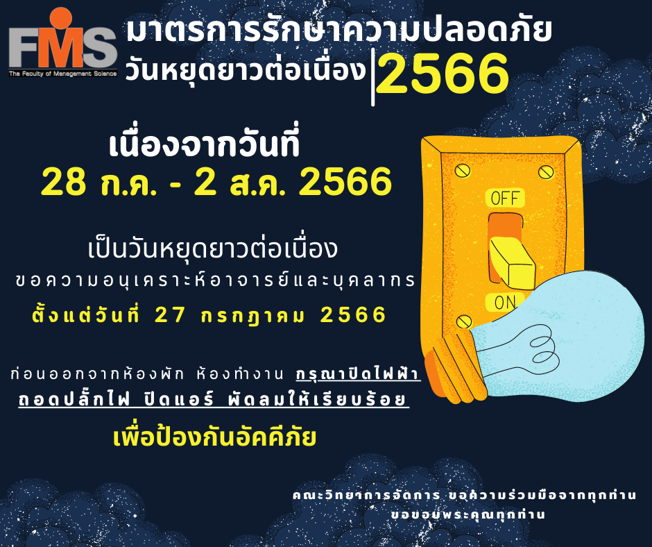 ขอความอนุเคราะห์อาจารย์และบุคลากร ตั้งแต่วันที่ 27 กรกฎาคม 2566 ก่อนออกจากห้องพัก ห้องทำงาน กรุณาปิดไฟฟ้า ถอดปลั๊กไฟ ปิดแอร์ พัดลมให้เรียบร้อย เพื่อป้องกันอัคคีภัย