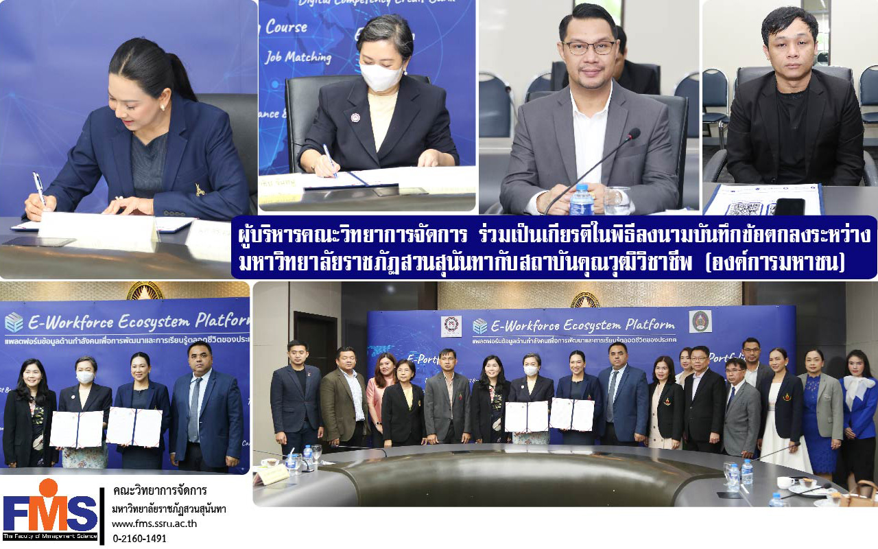 วันที่ 21 สิงหาคม 2566 ผู้ช่วยศาสตราจารย์ ดร.สมศักดิ์ คล้ายสังข์ คณบดีคณะวิทยาการจัดการ พร้อมด้วยอาจารย์ ดร.กฤษณะ เชื้อชัยนาท รองคณบดีฝ่ายวิชาการ เข้าร่วมเป็นเกียรติในพิธีลงนามบันทึกข้อตกลง ระหว่าง มหาวิทยาลัยราชภัฏสวนสุนันทา กับ สถาบันคุณวุฒิวิชาชีพ (องค์การมหาชน) โดยมีรองศาสตราจารย์ ดร.ชุติกาญจน์ ศรีวิบูลย์ อธิการบดีมหาวิทยาลัยราชภัฏสวนสุนันทา และนางสาวจุลลดา มีจุล รองผู้อำนวยการฝ่ายวิชาการ รักษาการผู้อำนวยการสถาบันคุณวุฒิวิชาชีพ ร่วมลงนามบันทึกข้อตกลง ณ ห้องประชุมสภามหาวิทยาลัย อาคาร 31 ชั้น 5 มหาวิทยาลัยราชภัฏสวนสุนันทา