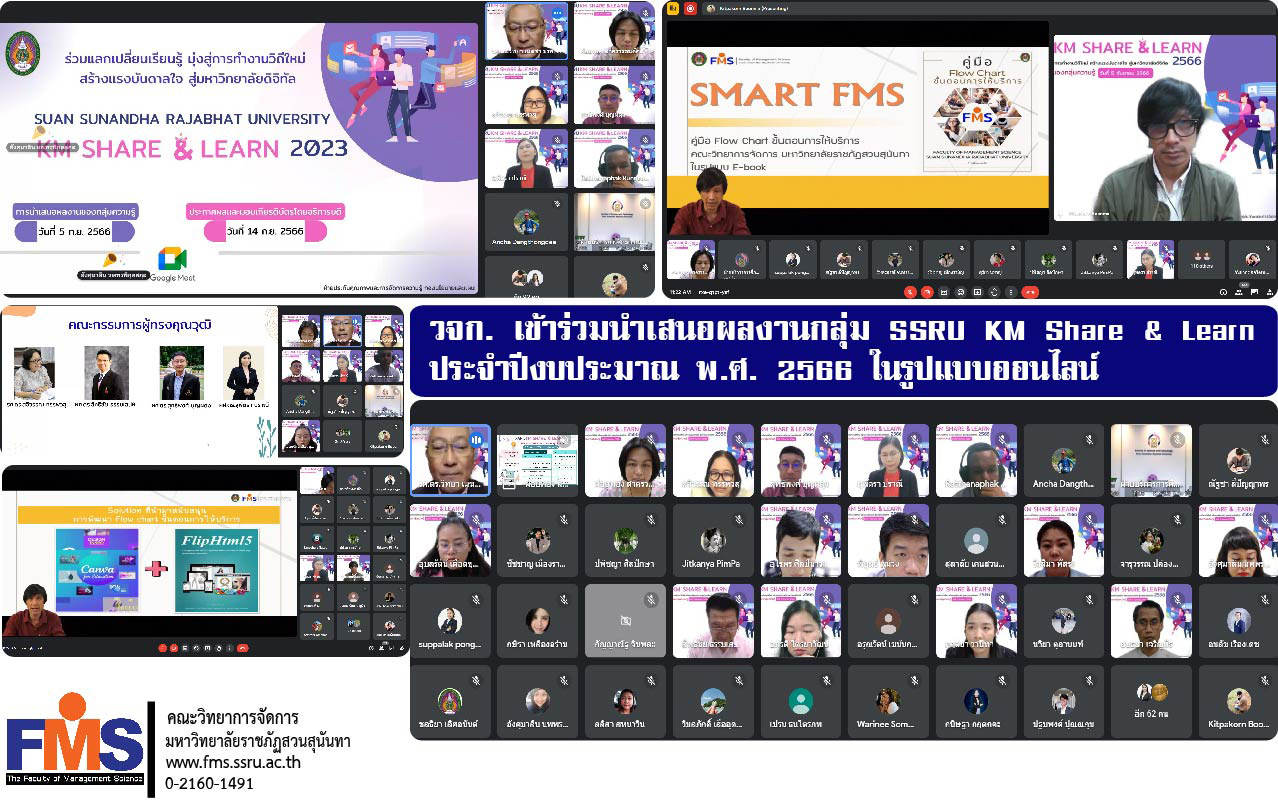 วันที่ 5 กันยายน 2566 คณะวิทยาการจัดการ มหาวิทยาลัยราชภัฏสวนสุนันทา เข้าร่วมกิจกรรมนำเสนอผลงานกลุ่ม SSRU KM Share & Learn ประจำปีงบประมาณ พ.ศ. 2566 การนำเสนอผลงานของกลุ่มความรู้ที่ส่งผลงานเข้าร่วมการสรรหาแนวปฏิบัติที่ดี จัดโดยฝ่ายประกันคุณภาพและการจัดการความรู้ กองนโยบายและแผน โดยกลุ่ม Smart FMS คณะวิทยาการจัดการ นำเสนอผลงานในหัวข้อ “คู่มือ Flow Chart ขั้นตอนการให้บริการ คณะวิทยาการจัดการ มหาวิทยาลัยราชภัฏสวนสุนันทา ในรูปแบบ E-book” โดยมีผู้ทรงคุณวุฒิเข้าร่วมรับฟัง ในรูปแบบการจัดกิจกรรมผ่านโปรแกรม Google Meet ซึ่งการนำเสนอเป็นไปด้วยความเรียบร้อย สำหรับการประกาศผลรางวัลจะจัดขึ้นในวันพฤหัสบดีที่ 14 กันยายน 2566 นี้