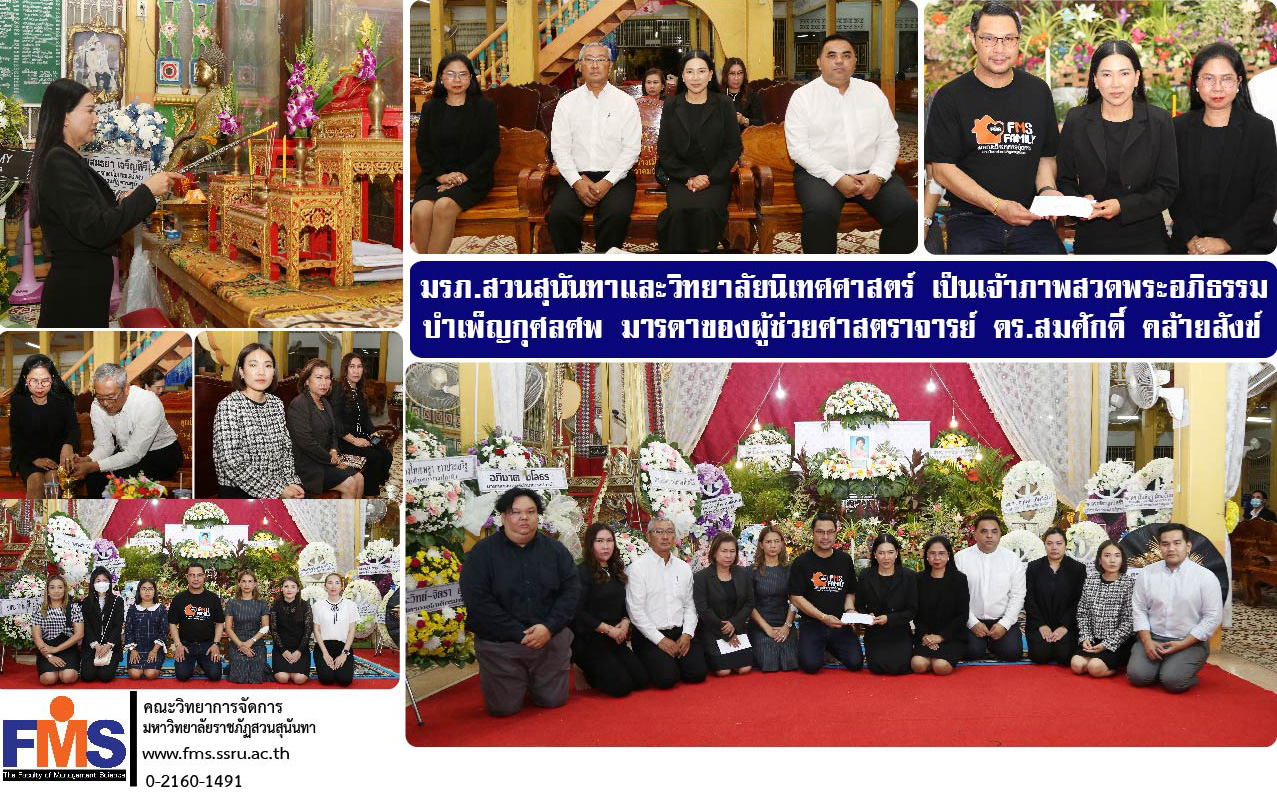 เมื่อวันที่ 5 กันยายน 2566 เวลา 20.00 น. มหาวิทยาลัยราชภัฏสวนสุนันทา และวิทยาลัยนิเทศศาสตร์ ร่วมเป็นเจ้าภาพในงานสวดพระอภิธรรมบำเพ็ญกุศลศพ คุณแม่สำรวล คล้ายสังข์ มารดาของผู้ช่วยศาสตราจารย์ ดร.สมศักดิ์ คล้ายสังข์ คณบดีคณะวิทยาการจัดการ โดยมีรองศาสตราจารย์ ดร.ชุติกาญจน์ ศรีวิบูลย์ อธิการบดีมหาวิทยาลัยราชภัฏสวนสุนันทา เป็นประธานในพิธี พร้อมด้วยรองอธิการบดี คณบดีวิทยาลัยนิเทศศาสตร์ รองคณบดี คณาจารย์ และบุคลากร ร่วมพิธีสวดพระอภิธรรมบำเพ็ญกุศล ณ ฌาปนสถานวัดรอเจริญ หมู่ 1 ต.บางปลาม้า อ.บางปลาม้า จ.สุพรรณบุรี
