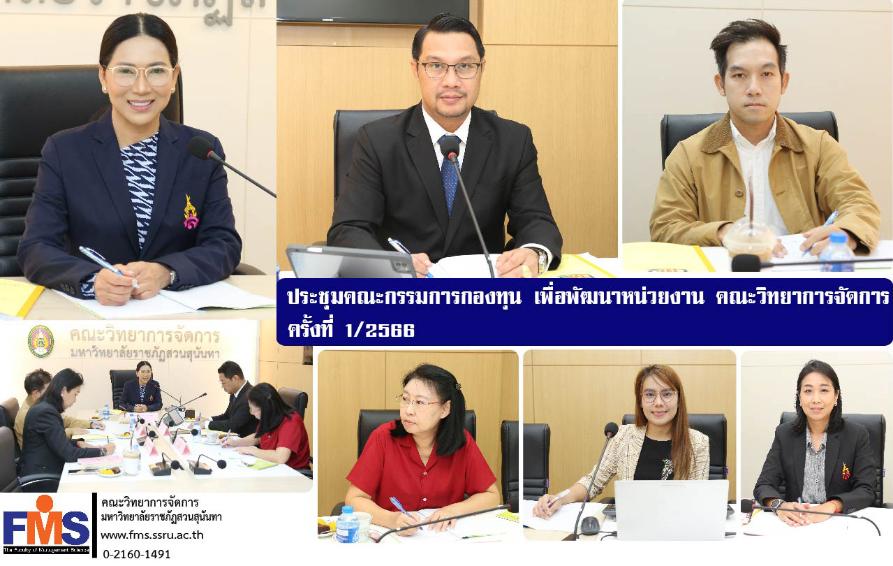 วันที่ 6 กันยายน 2566 เวลา 09.30 น. คณะวิทยาการจัดการ มหาวิทยาลัยราชภัฏสวนสุนันทา จัดประชุมคณะกรรมการกองทุน เพื่อพัฒนาหน่วยงาน คณะวิทยาการจัดการ ครั้งที่ 1/2566 โดยรองศาสตราจารย์ ดร.ชุติกาญจน์ ศรีวิบูลย์ อธิการบดีมหาวิทยาลัยราชภัฏสวนสุนันทา เป็นประธานการประชุม พร้อมด้วยผู้ช่วยศาสตราจารย์ ดร.สมศักดิ์ คล้ายสังข์ คณบดีคณะวิทยาการจัดการ อาจารย์ ดร.อิทธิภูมิ พรหมมา รองคณบดีฝ่ายแผนงานและประกันคุณภาพ และคณะกรรมการกองทุนฯ เข้าร่วมประชุม ณ ห้องประชุมรวมใจการจัดการ