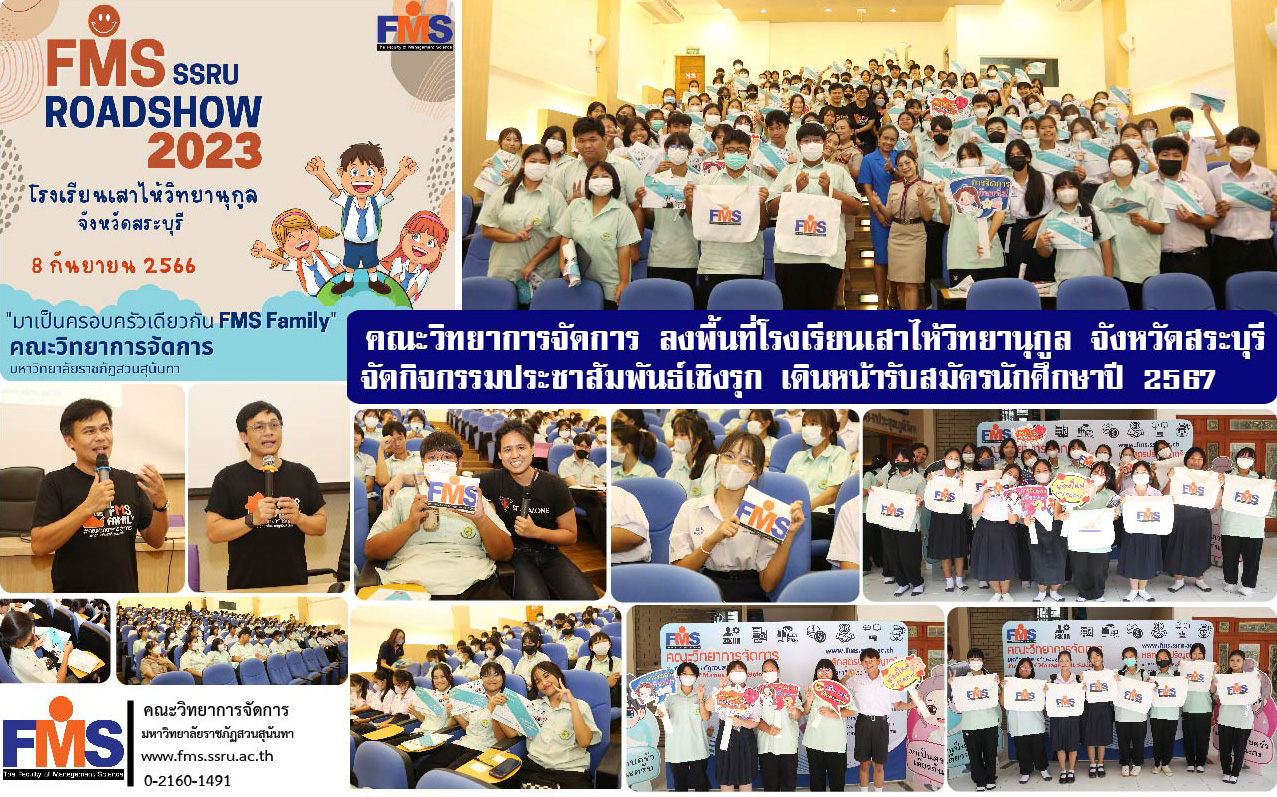 เมื่อวันที่ 8 กันยายน 2566 คณะวิทยาการจัดการ มหาวิทยาลัยราชภัฏสวนสุนันทา นำโดย อาจารย์ ดร.ปิติมนัส บรรลือ รองคณบดีฝ่ายบริหาร พร้อมด้วยอาจารย์ ดร.กฤษณะ เชื้อชัยนาท รองคณบดีฝ่ายวิชาการ ทีมบุคลากรและนายภริต ธนสุวรรณ ศิษย์เก่าคณะวิทยาการจัดการ ลงพื้นที่โรงเรียนเสาไห้วิทยานุกูล จังหวัดสระบุรี ดำเนินโครงการประชาสัมพันธ์เชิงรุก ตามนโยบายการมุ่งเน้นการประชาสัมพันธ์เชิงรุกของผู้ช่วยศาสตราจารย์ ดร.สมศักดิ์ คล้ายสังข์ คณบดีคณะวิทยาการจัดการ ในประชาสัมพันธ์ข้อมูลหลักสูตรที่เปิดการเรียนการสอนในคณะฯ ให้แก่นักเรียน การแนะแนวการศึกษาต่อ ในคณะวิทยาการจัดการ มหาวิทยาลัยราชภัฏสวนสุนันทา เพื่อเตรียมความพร้อมการรับสมัครนักศึกษาใหม่ ประจำปี 2567 ซึ่งมีคณะครูและนักเรียนให้การต้อนรับและเข้าร่วมกิจกรรมอย่างอบอุ่น ณ หอประชุมอาคาร 5 โรงเรียนเสาไห้วิทยานุกูล จังหวัดสระบุรี