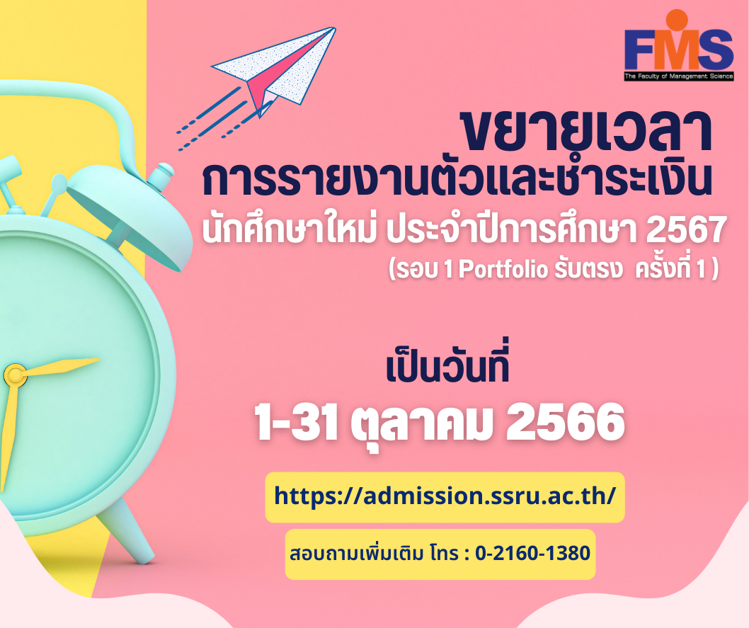 ขยายเวลาการรายงานตัวและชำระเงิน นักศึกษาใหม่ ประจำปีการศึกษา 2567 (รอบ 1 Portfolio รับตรง ครั้งที่ 1 )