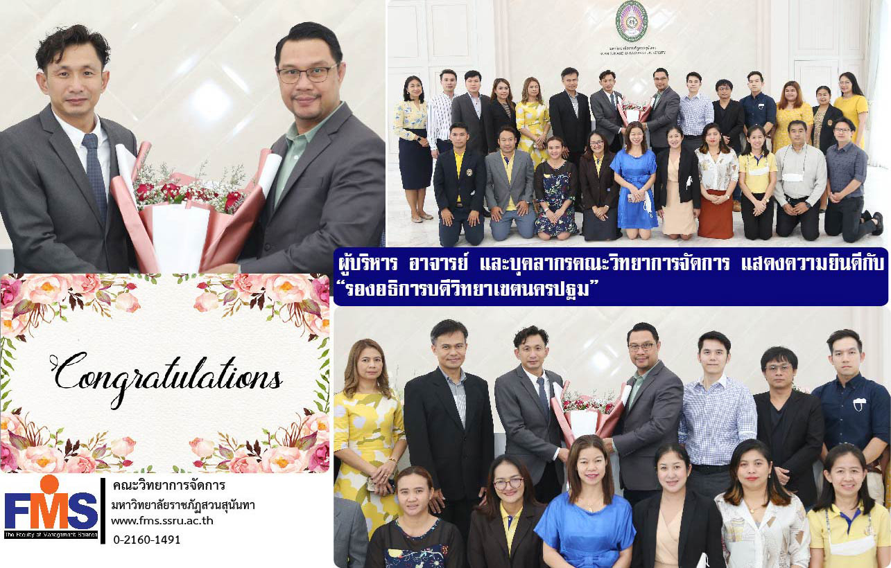 วันที่ 2 ตุลาคม 2566 ผู้ช่วยศาสตราจารย์ ดร.สมศักดิ์ คล้ายสังข์ คณบดีคณะวิทยาการจัดการ พร้อมด้วยรองคณบดี อาจารย์ และบุคลากรสายสนับสนุนวิชาการประจำคณะ มอบช่อดอกไม้แสดงความยินดี แด่อาจารย์ ดร.แก่นเพชร ศรานนทวัฒน์ ในโอกาสที่ได้รับการแต่งตั้งให้ดำรงตำแหน่ง รองอธิการบดีวิทยาเขตนครปฐมมหาวิทยาลัยราชภัฏสวนสุนันทา ณ ห้องรับรองสำนักงานอธิการบดี อาคาร 31 ชั้น 1