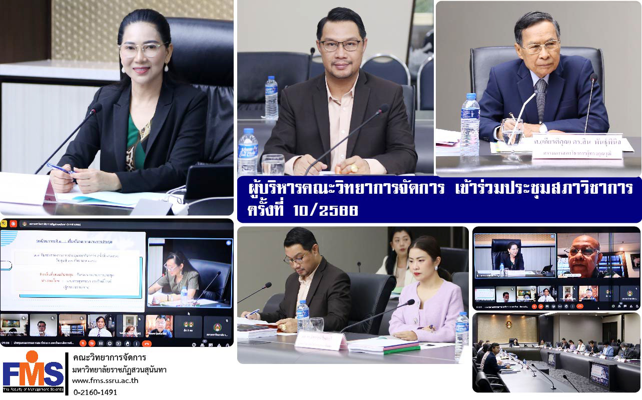 วันที่ 11 ตุลาคม 2566 เวลา 09.00 น. ผู้ช่วยศาสตราจารย์ ดร.สมศักดิ์ คล้ายสังข์ คณบดีคณะวิทยาการจัดการ เข้าร่วมประชุมสภาวิชาการ ครั้งที่ 10 /2566 โดยมีรองศาสตราจารย์ ดร. ชุติกาญจน์ ศรีวิบูลย์ อธิการบดีมหาวิทยาลัยราชภัฏสวนสุนันทา เป็นประธานการประชุม โดยการประชุมมีประเด็นวาระที่สำคัญ และวาระอื่นๆที่เกี่ยวข้อง ณ ห้องประชุมสภามหาวิทยาลัยอาคาร 31 ชั้น 5 และการประชุมออนไลน์ผ่านโปรแกรม Google Meet
